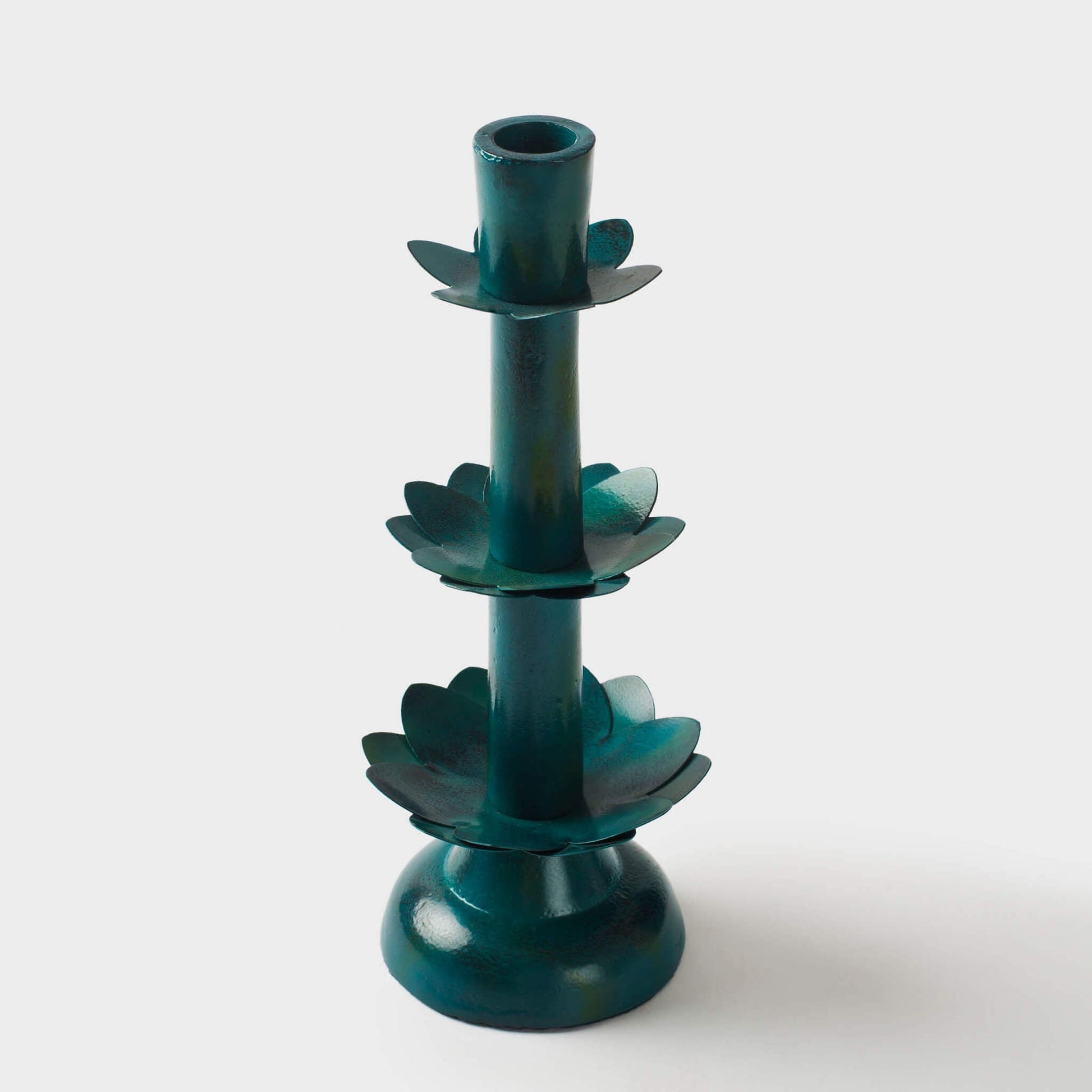 Inspired by the flowers we love, the tiers of petals in the Lotus Bloom Metal Taper Candleholders create a light, elegant look. Perfect accent on your mantel, dining table, or console. Each finish pairs beautifully with a soft, neutral candle or a bolder pop of color, your choice! Available in two sizes: • Tall – 9" height • Small – 6" height Perfect for taper candles or styled as sculptural accents, they brighten mantels, centrepieces, or shelves with their playful palette and artisanal detailing. Pair them together for a tiered, layered look or let each shine solo. A joyful blend of function and floral flair, ideal for gifting or adding a burst of sunshine to your own space.