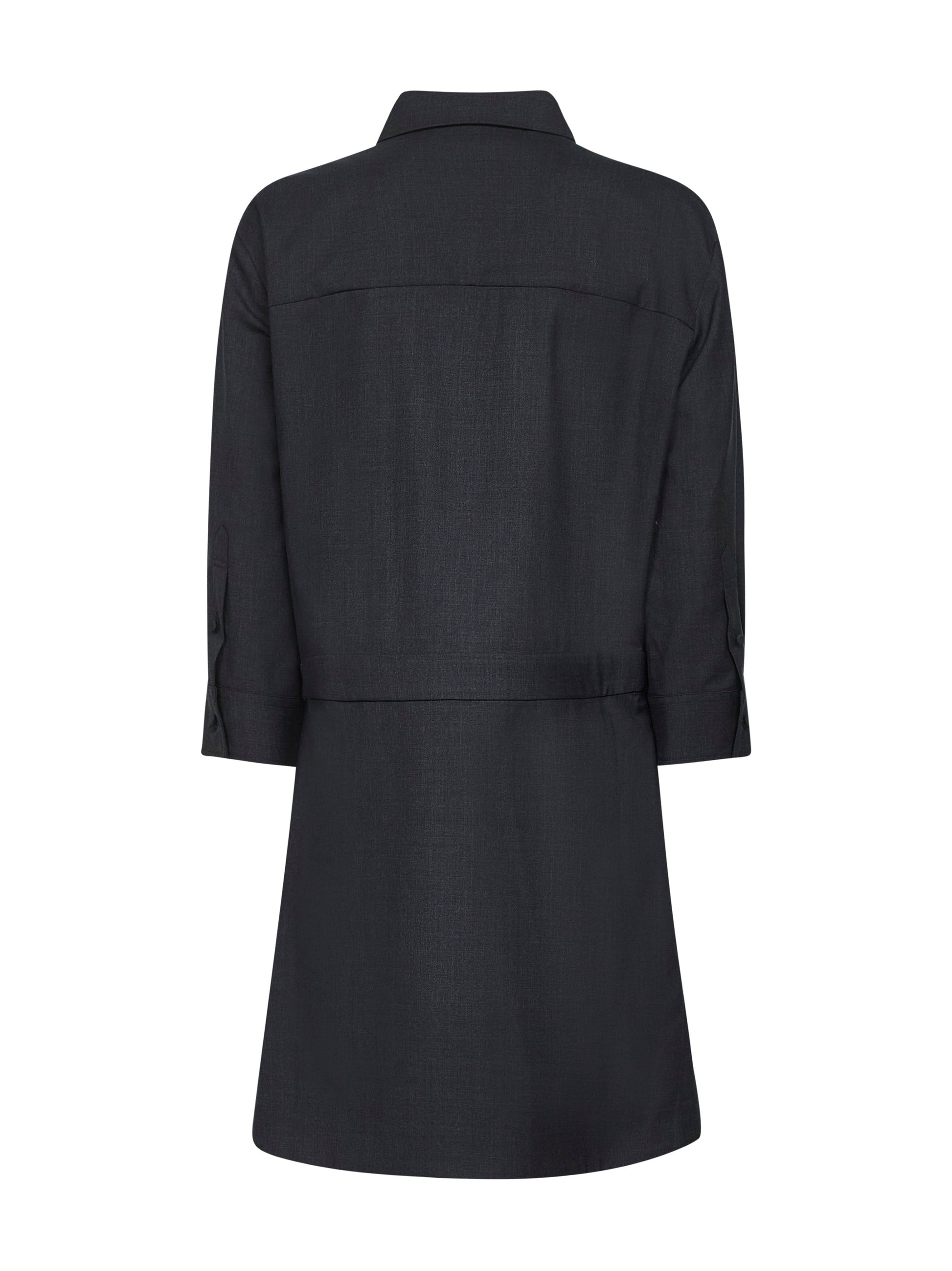 •Partial front button placket •Shirt collar •Three-quarter sleeves, buttoned cuffs •Metal front Horsebit detail at waist •Inverted pleat at front •Slightly flared skirt •Fabric-covered buttons •Grey color •100% Wool •Made in Italy