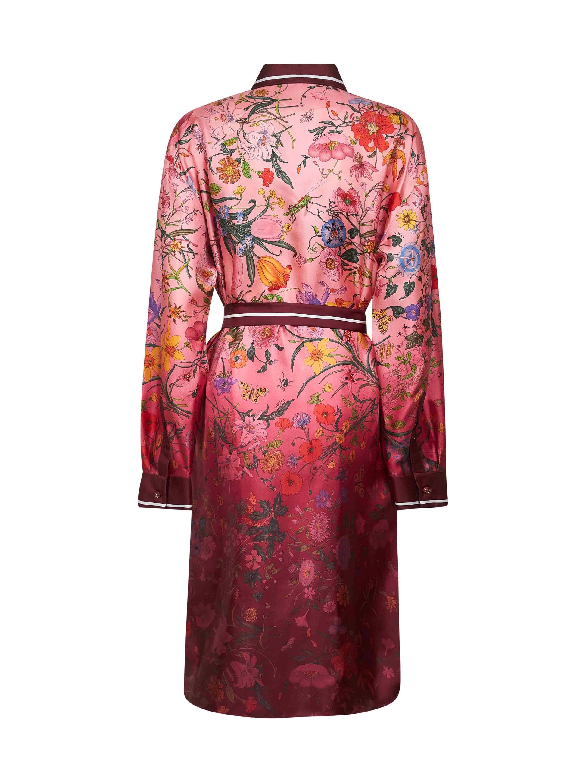 •Front button placket •Shirt collar •Long sleeves, dropped shoulders, buttoned cuffs •Adjustable and detachable belt at the waist •Shirttail hem •Burgundy silk contrasting striped pattern collar, cuffs, placket and belt •All-over gradient Gucci Flora print pink and Gucci Rosso Ancora red silk twill design •Color: multicolor •100% Silk •Made in Italy