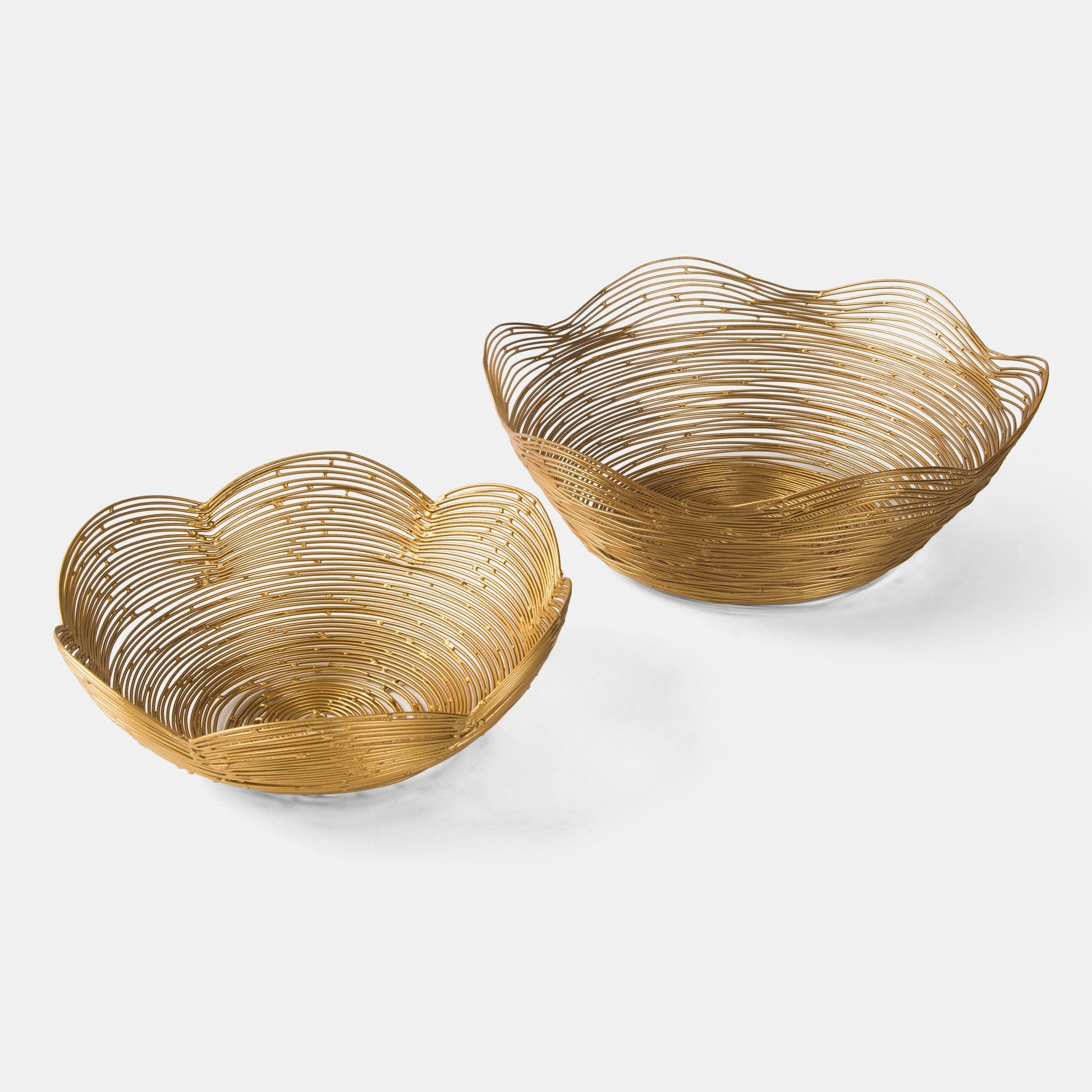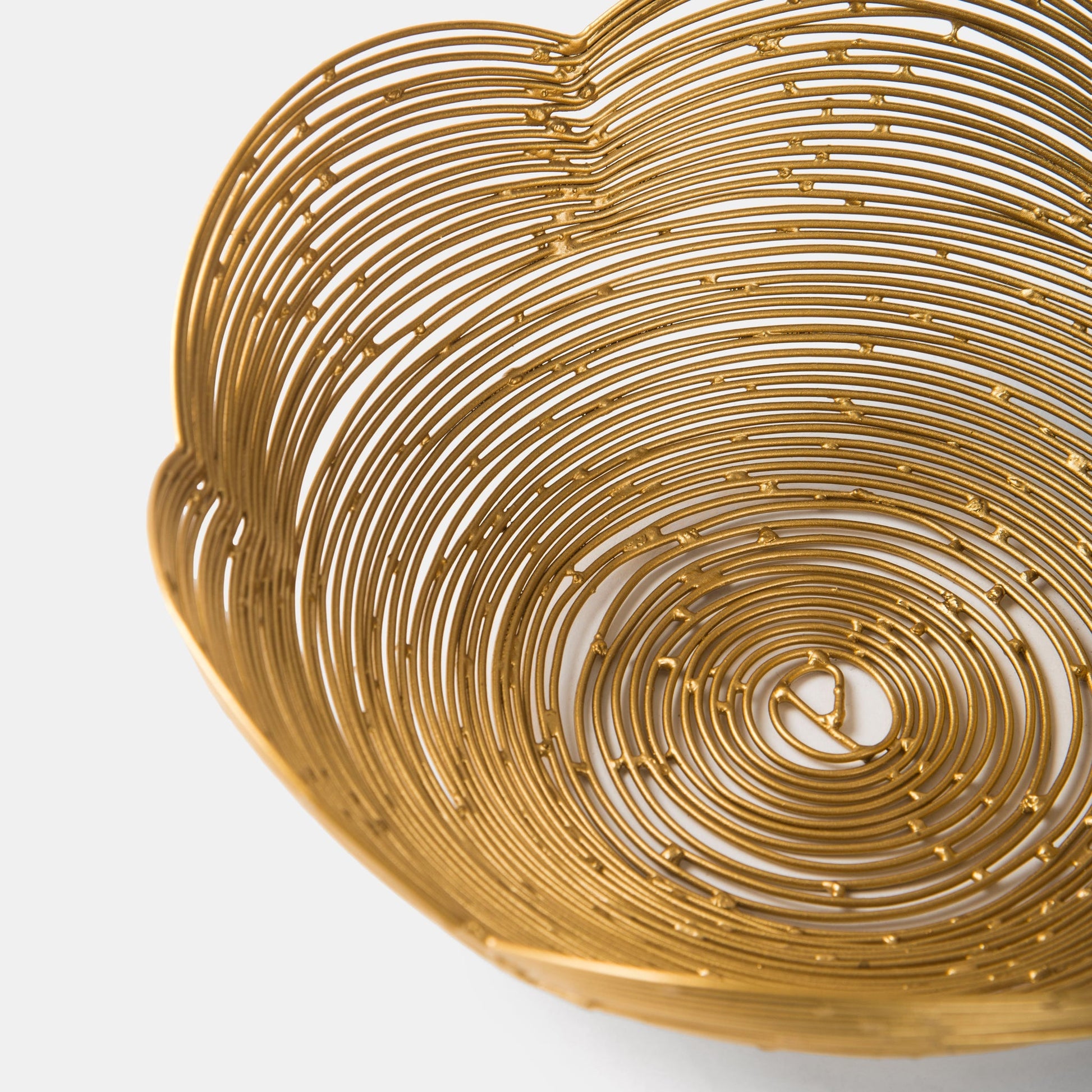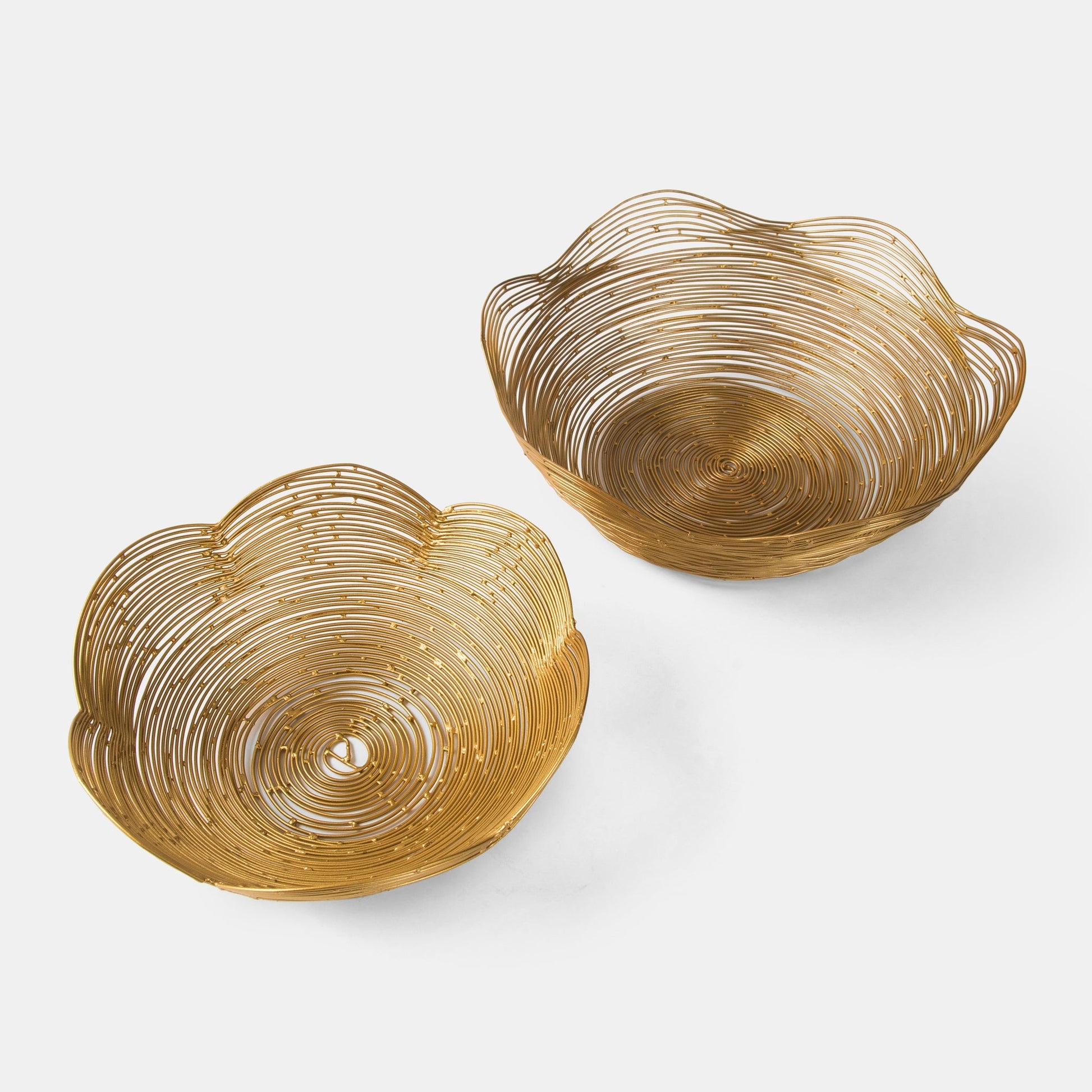 Gurez Valley handcrafted iron bowls features a flowing gold wire design that stacks neatly for easy storage. Perfect for serving fruits, vegetables, or as striking centerpieces, each bowl is finished in a warm gold tone with a sturdy base for stability. Designed for dry goods only, they add timeless elegance to any space and make a thoughtful gift. Medium: 9" Diameter x 3.5"H Large: 12" Diameter x 4"H