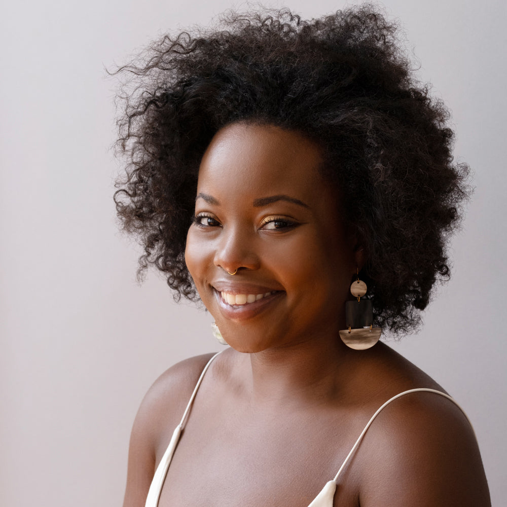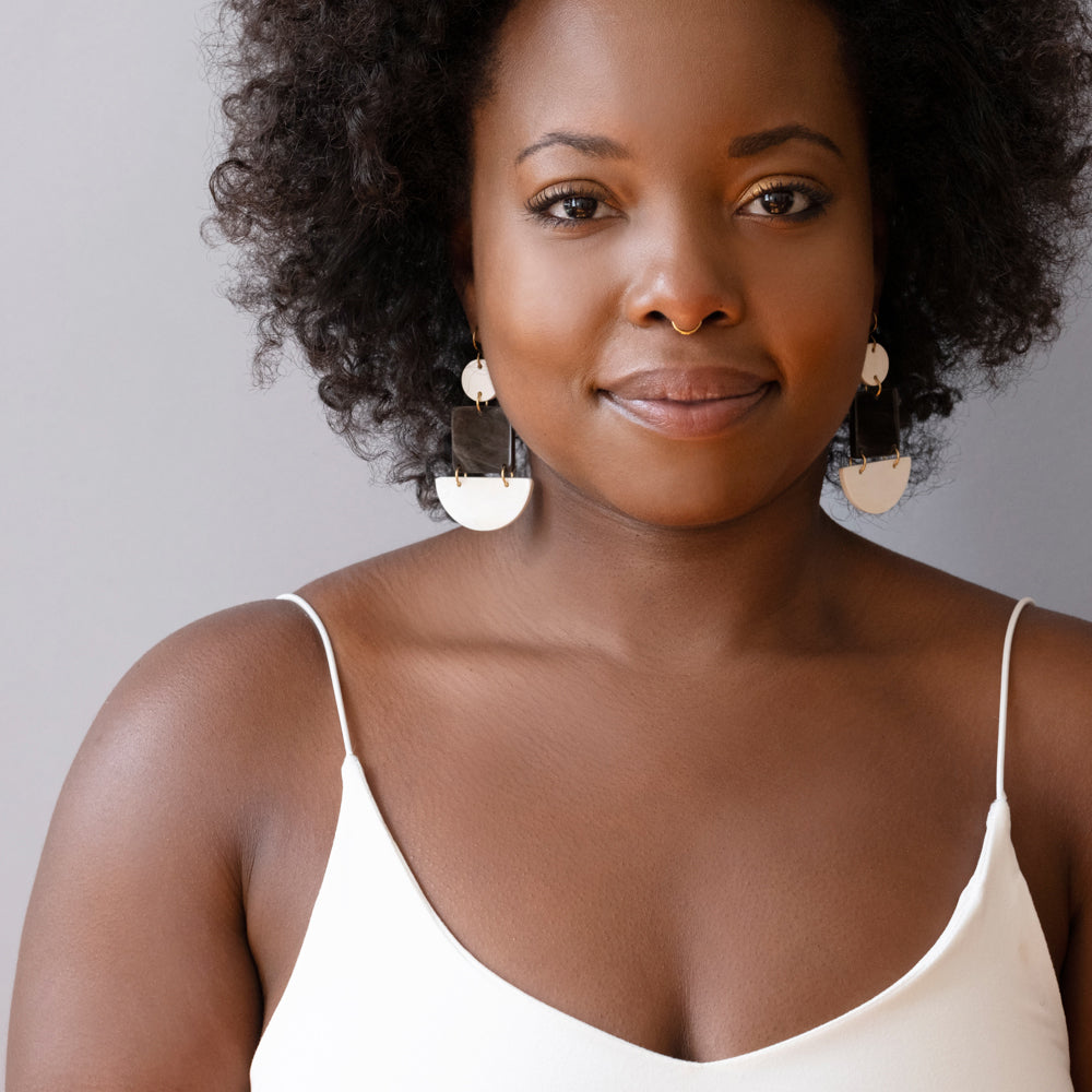 Hand carved and polished cow horn earrings in a bold multi-geometric design. A small circle balances on top of a square and half circle shape that is sure to give a statement in the multitudes of horn color tones.