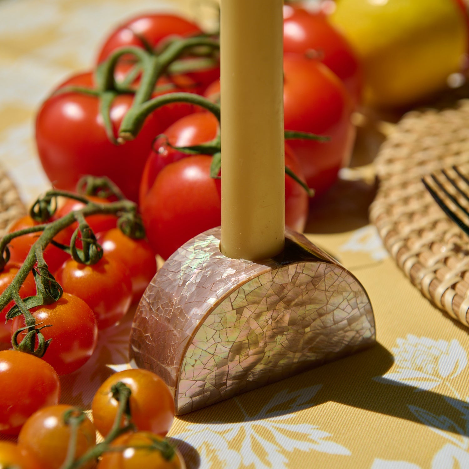Transform your space with the luminous charm of the Half Moon Mother of Pearl Candle Holders. This set of two features mother of pearl in a sleek half-moon design that shimmer softly in candlelight. These handmade pieces are a sophisticated addition to any mantel, dining table, or bedside vignette.
