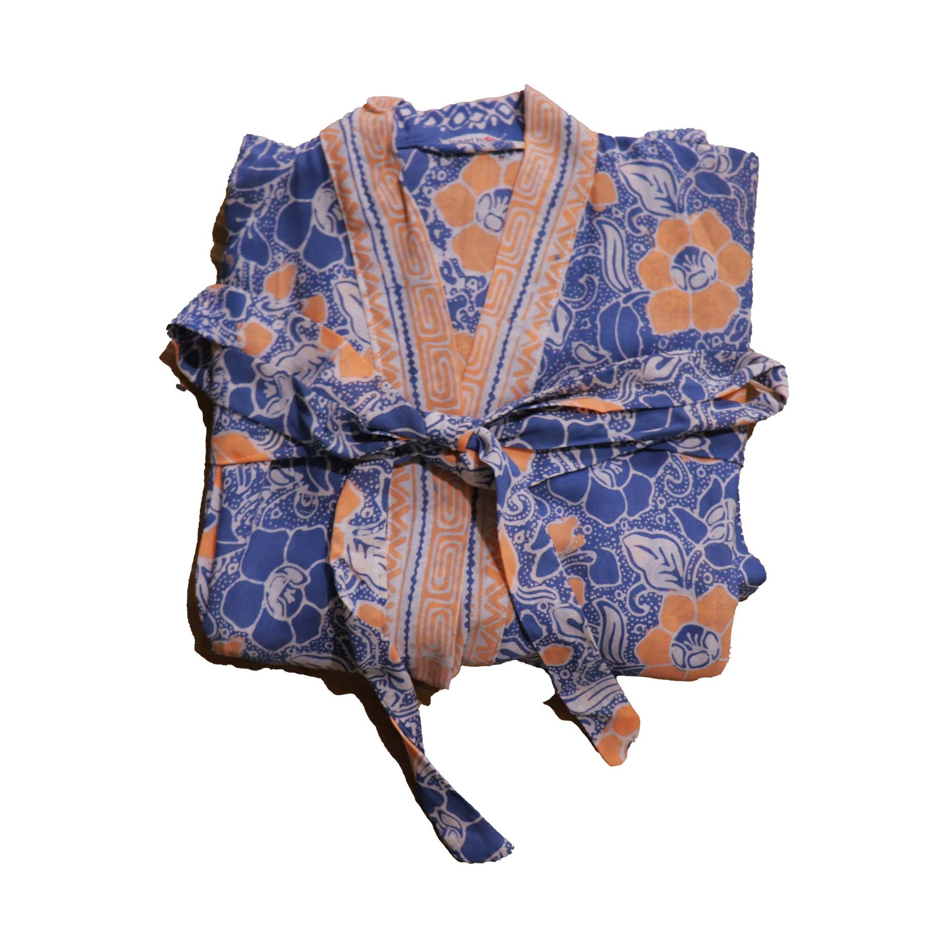 This batik kimono robe is made from white cotton fabric that is then hand-stamped and hand-dyed using 700 years old batik wax and dye technique. The batik fabric is also then sun baked.
