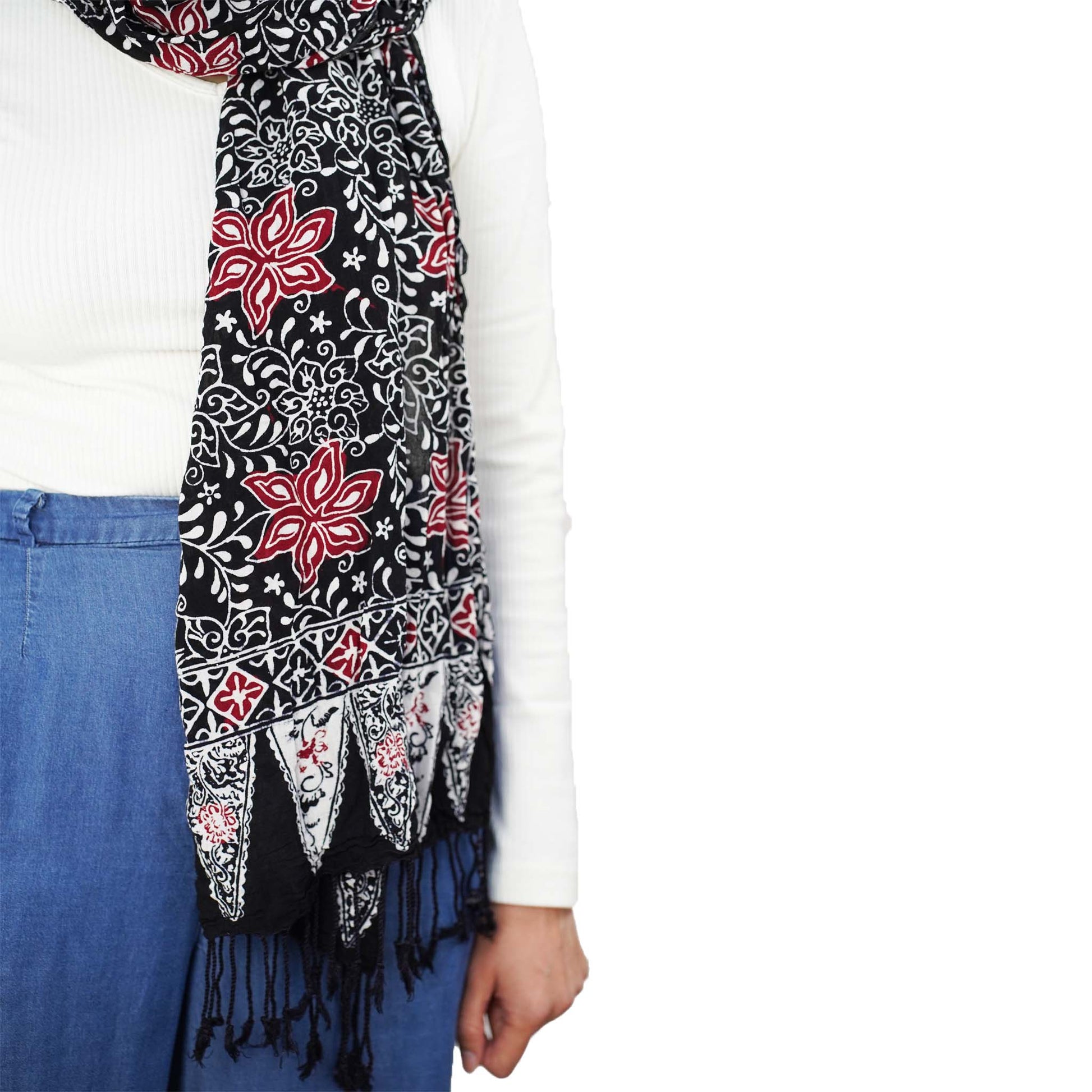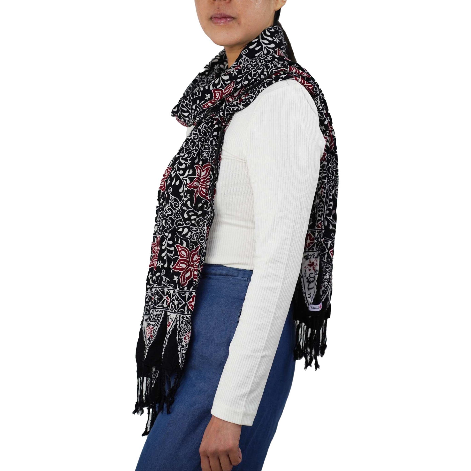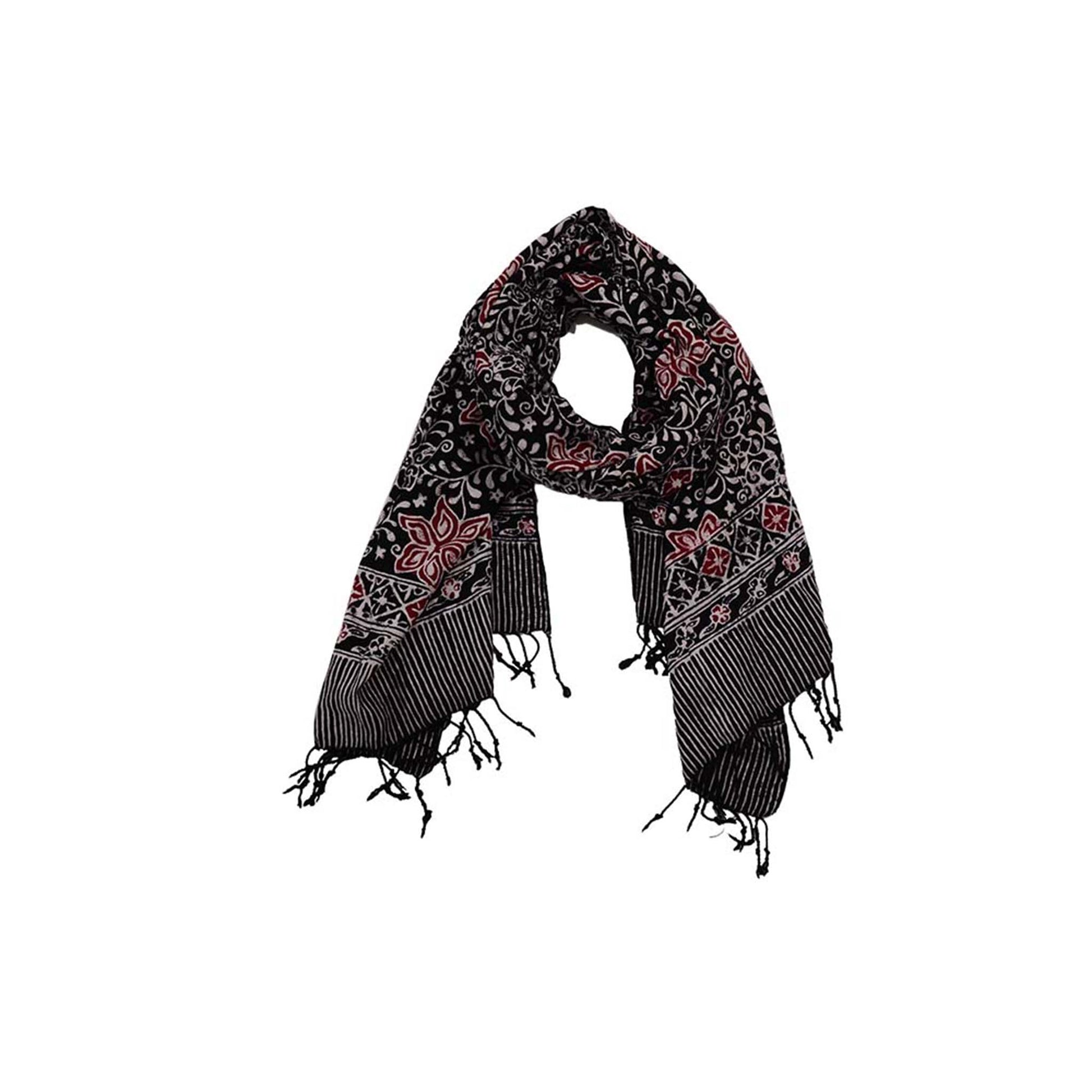 Hand Dyed Batik Scarf, 100% Cotton Fabric, Black Red Floral Star