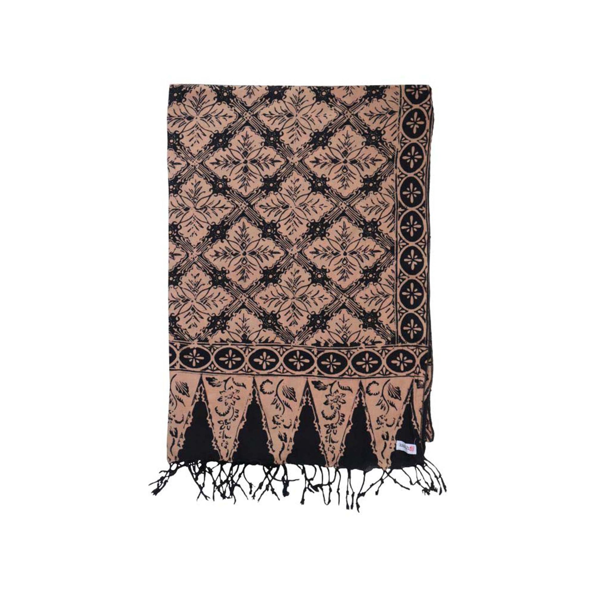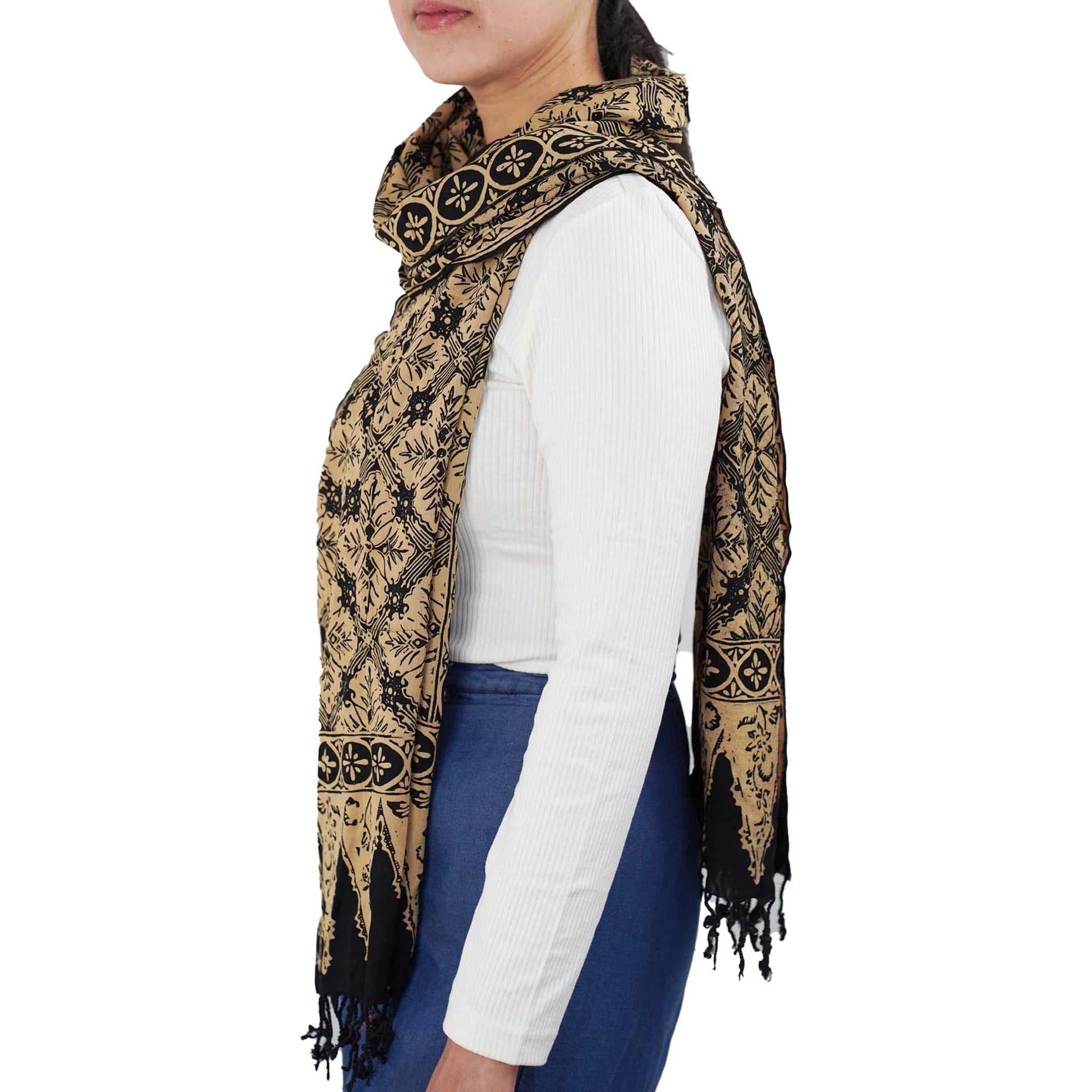 This is a hand-dyed and hand-stamped batik scarf, handmade by artisans. This fabric is handmade by artisans in Java using centuries old wax & dye batik technique.