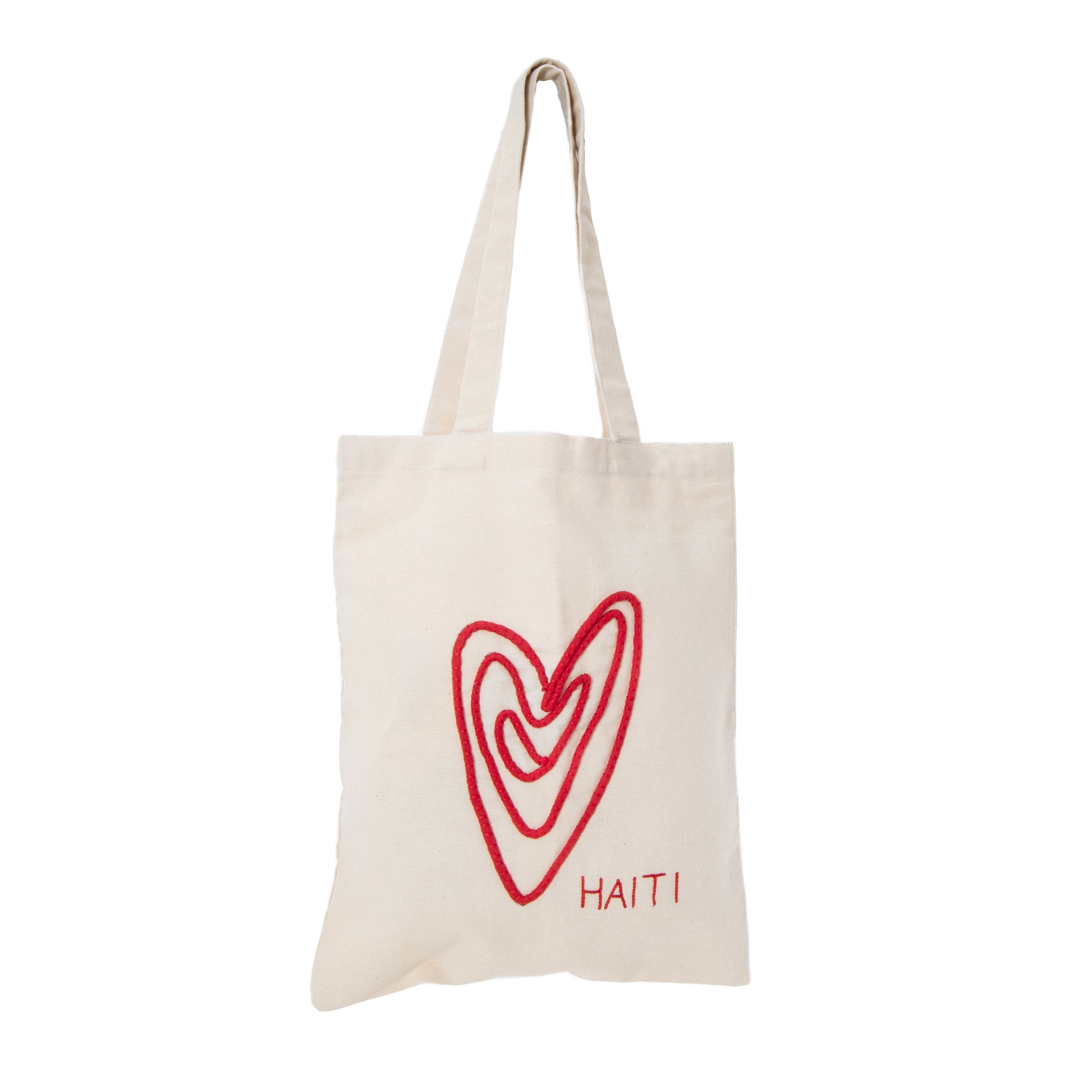 Show your love for Haiti!! Our tote bag is made with 100% Cotton canvas, and each handcrafted appliqué is embroidered by our artisans directly onto the bag.