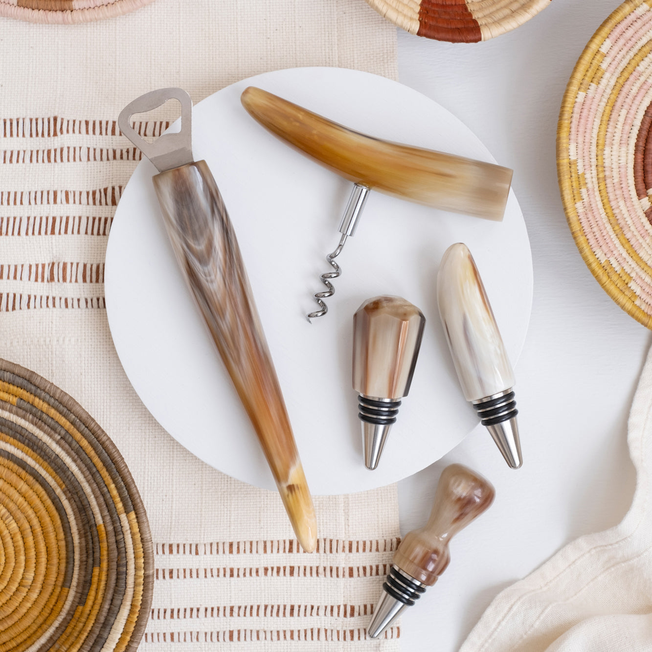 Pop the top of your favorite bottle with this gorgeous Ankole Horn Bottle Opener. It's a perfect gift for your favorite beer aficionado or ethical addition to your curated bar. Assorted color tones.