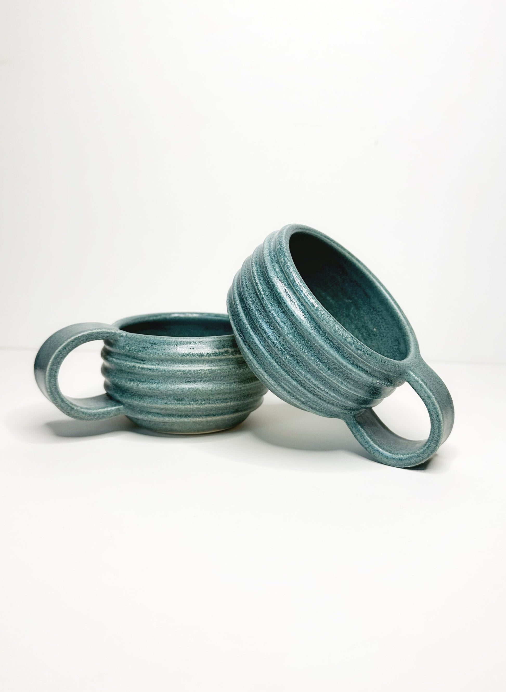 Set of two. Our handcrafted clay 5-oz cups and mugs bring a touch of artisanal charm to your everyday rituals. Each piece is uniquely handmade without molds, ensuring no two are exactly alike. Perfect for a cozy cappuccino or tea. Embrace the beauty of imperfection. CLAY: BB Mix + Sand GLAZE: Semi Matte. Forest Green color Handcrafted from USA-sourced clay. Unique, mold-free, small-batch production. Glazed finish (not microwave-safe). We recommend handwashing to prevent surface decay and scratches. Please note that slight variations in size may occur due to the clay's natural behavior during the drying and firing process.