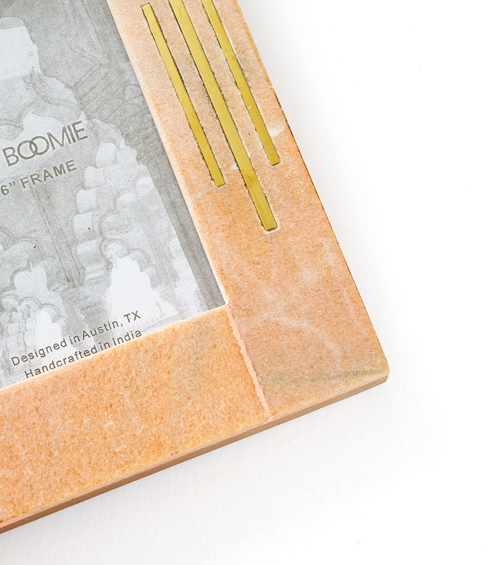Reminiscent of the "Pink City" of Jaipur where many buildings are painted pink the Jaipuri 4x6 Picture Frame features a soft dusky pink marble, intricately inlaid with brass. Handcrafted by master artisans in India the frame features a two-way easel back, metal swivel tabs to access opening, glass cover and a metal d-rings for hanging vertically and horizontally.