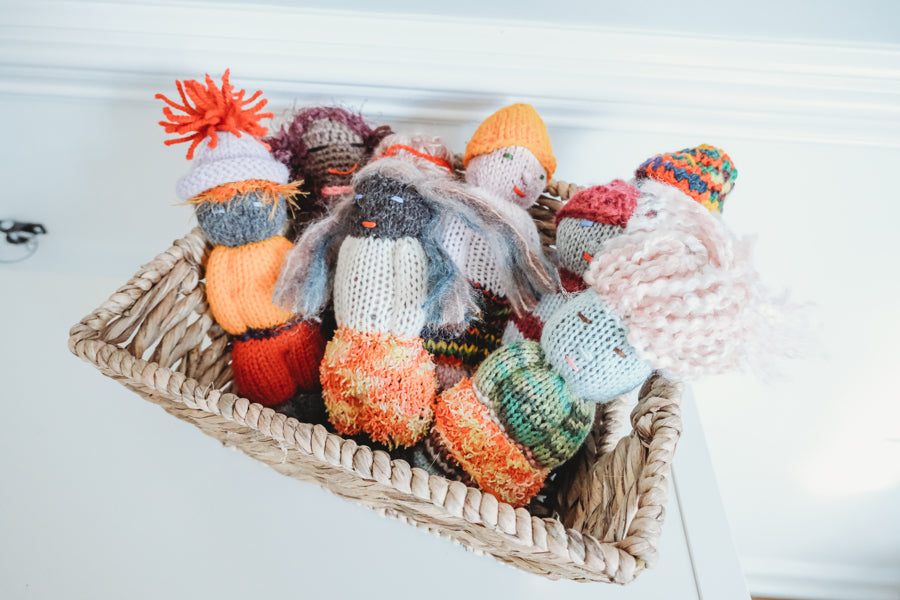 These playful Jou Jou Dolls (8" tall) are made one-by-one by our knitters. Each doll is one-of-a-kind and no two are alike. These dolls are made with love by artisans from donated yarn.