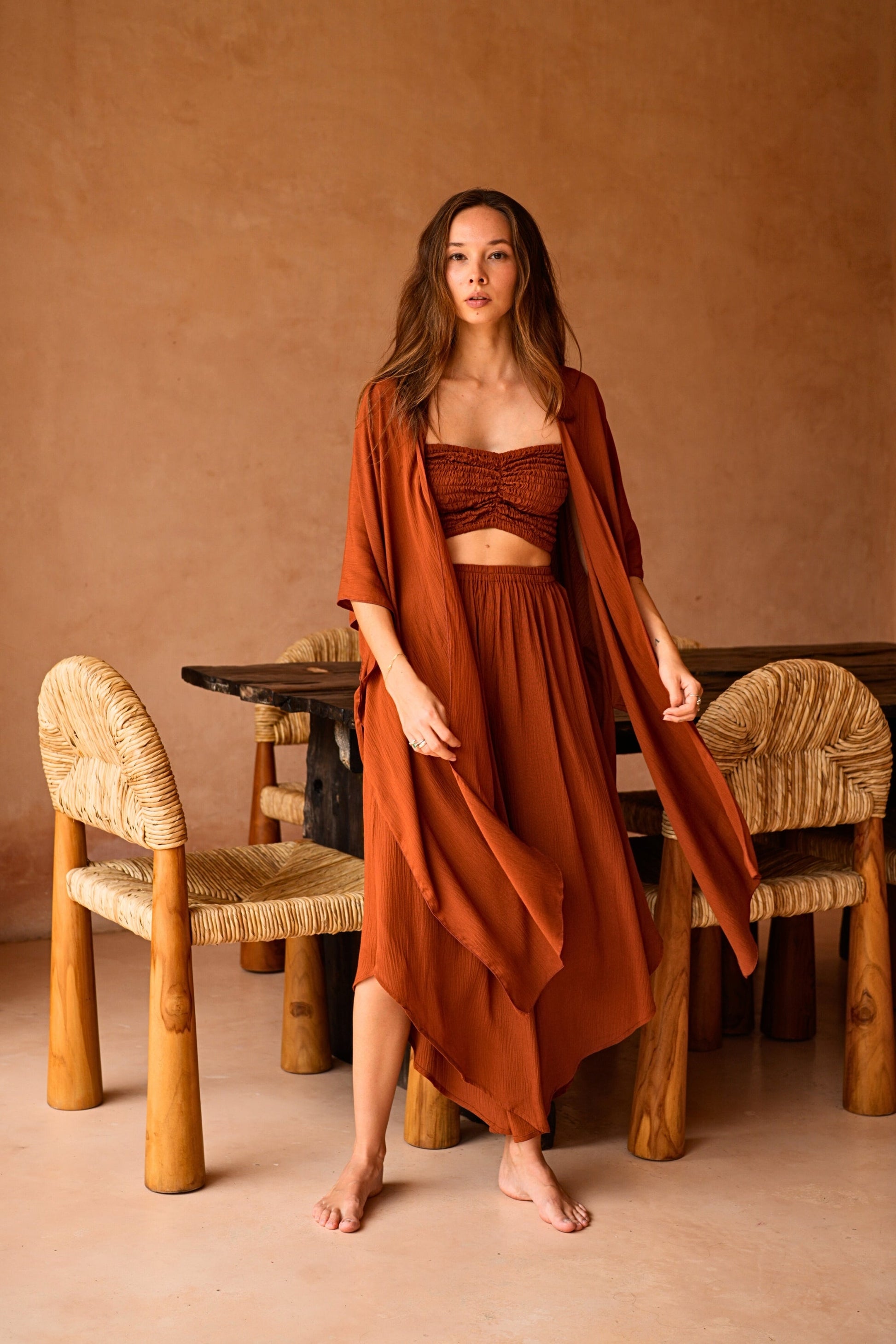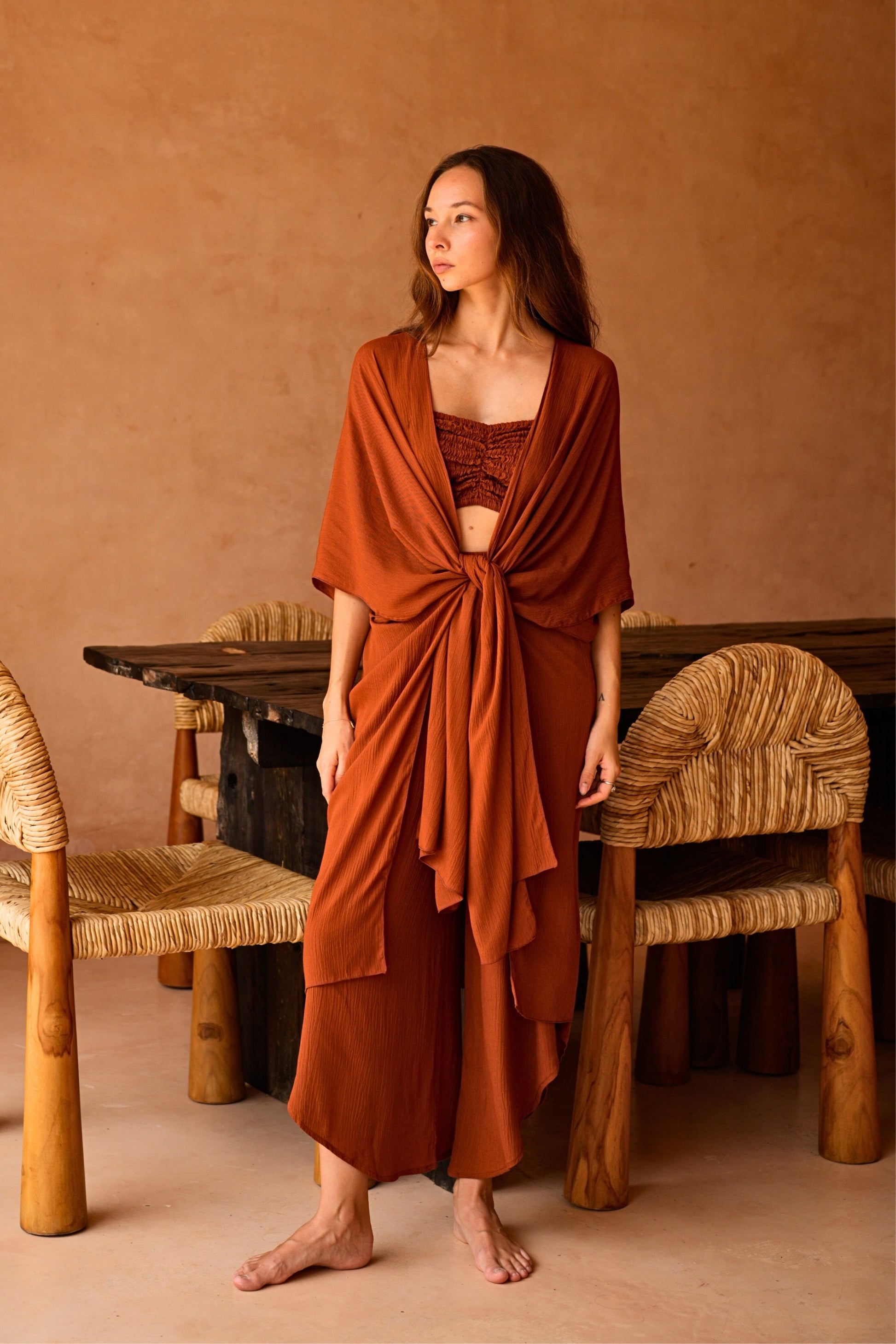 The Kaia Flowy Kimono Wrap Duster is a lightweight, sheer layering piece designed for transitional weather and effortless styling. Featuring an open front with optional tie closure, it can be worn loose for a relaxed drape or wrapped for a more defined silhouette. Made to pair with the Winona Tube Top and Pants Set, this flowy duster adds movement and elegance to any look—perfect for day-to-night wear or casual layering. One Size will fit (small to large). Material: Rayon Shipping & Returns: Return accepted for store credit only. Please see our Shipping & Returns page for more details.