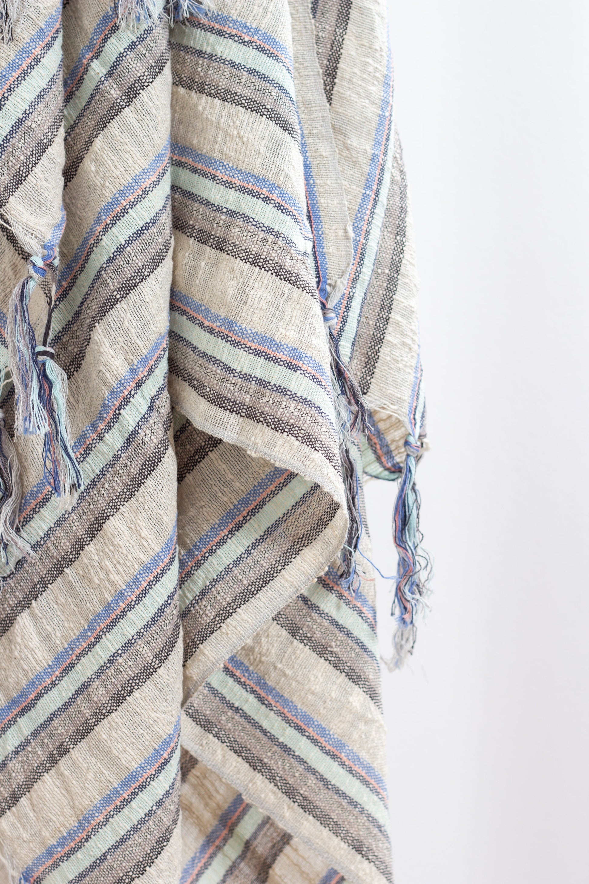 Introducing the Kalkan Towel, a luxurious blend of style and function. This towel features a stunning gray base accented with bold navy and blue stripes, creating a modern and sophisticated look. Made from a soft, absorbent cotton-linen blend, this towel is perfect for both lounging at home and drying off after a refreshing swim. Its unique design and high-quality construction make it a must-have for any bathroom. Use it as a beach towel, a bath towel, or even as a stylish throw for your living room. The possibilities are endless with the Kalkan Towel.