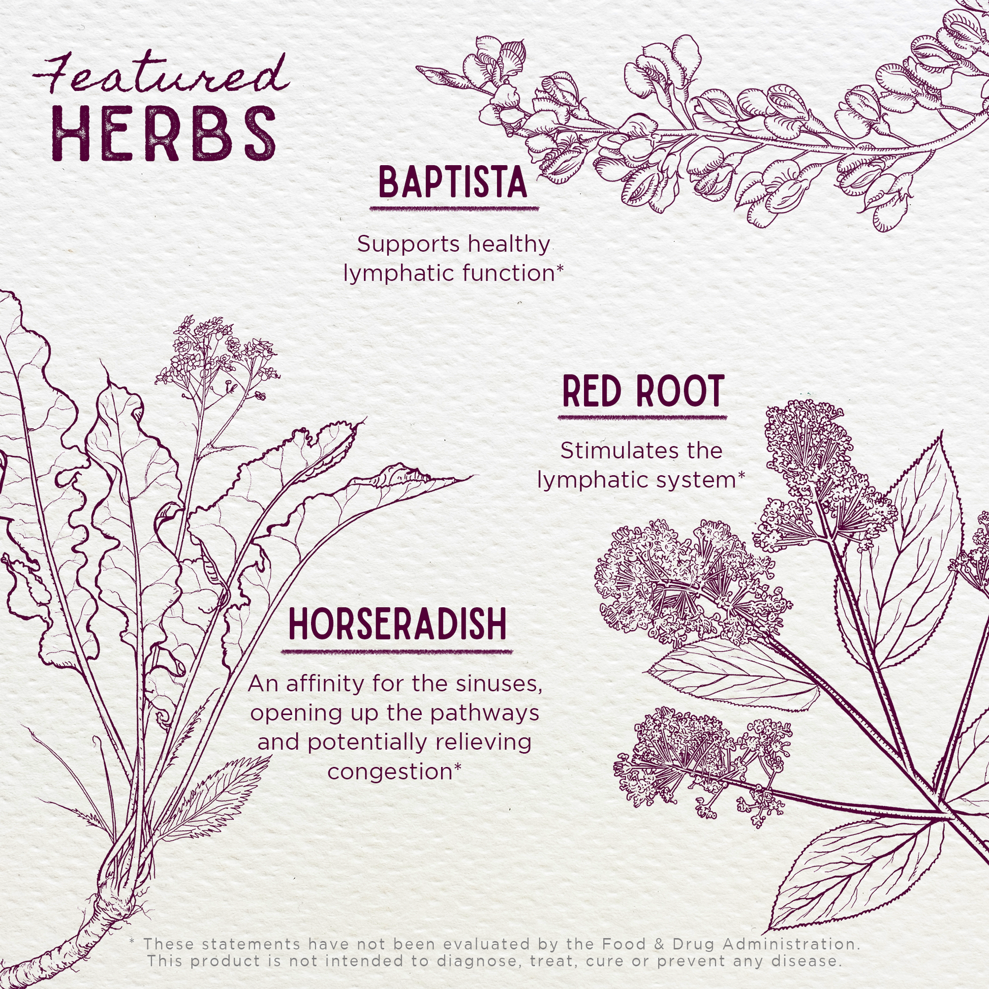 - Baptisia root: Baptisia tinctoria, also known as Wild Indigo, is native to the Northeastern United States and supports healthy lymphatic function, carrying immune properties into the nooks and crannies of the head.