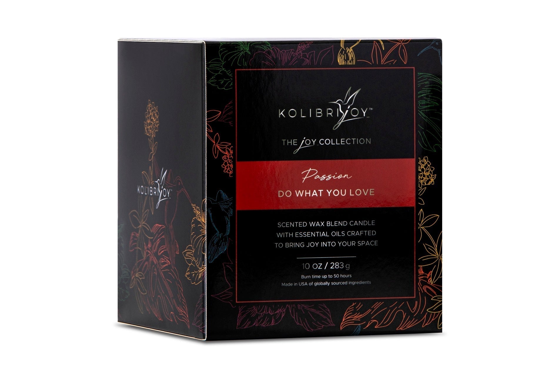 Introducing KolibriJoy – a hand-crafted candle collection that combines two things I hold dear: the elegance of a ‘Kolibri’ (hummingbird in German) and the joy I find in life’s small moments, inspired by my beautiful German mother, whose wisdom taught me to cherish the little things. Fulfill your desires with our Passion Candle and remind yourself to ‘Do What You Love’ today and every day. This big, bold fruity fragrance is strong, and sexy & ignites a fire from within to follow your desires. The heart of the fragrance contains plum, pear, jasmine, rose, apple, cassis, gardenia, chamomile and pineapple accented by orange and grapefruit followed later by a sugary accord. Essential oils of orange, davana & elemi support the delicate purity of our joy molecule functional fragrance designed to help support a joyful mood-enhancing benefit. Designed for a fast hot throw, soy food-grade paraffin wax blend candle with 2 cotton wicks & essential oils. Thick-wall handblown glass with matte black exterior, and silver logo presented in a gorgeous reusable box with a special hand-drawn signature design by a talented artist in MA in a fragrance-specific sleeve. 10oz candle. Burn time up to 50 hours.