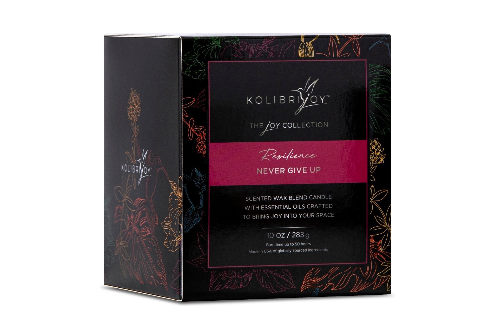 Introducing KolibriJoy – a hand-crafted candle collection that combines two things I hold dear: the elegance of a ‘Kolibri’ (hummingbird in German) and the joy I find in life’s small moments, inspired by my beautiful German mother, whose wisdom taught me to cherish the little things. Channel your inner warrior goddess with our Resilience Candle and remind yourself ‘Never Give Up’ today and every day. An elegant scent that conveys sophisticated luxury, the heart of the fragrance contains sweet vanilla, cocoa and lavender. Essential oils of lemon, clove leaf, eucalyptus, ginger, lavandin and patchouli support the delicate purity of our joy molecule functional fragrance for a mood-enhancing benefit. Designed for a fast hot throw, soy food-grade paraffin wax blend candle with 2 cotton wicks & essential oils. Thick-wall handblown glass with matte black exterior, and silver logo presented in a gorgeous reuseable box with a special hand-drawn signature design by a talented artist in MA. 10oz candle. Burn time up to 50 hours.
