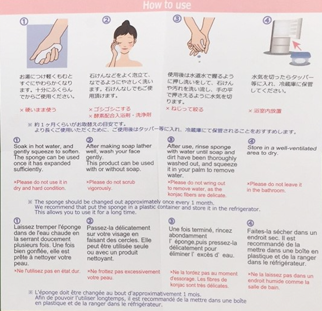 Just soak the dried sponge in water for a few moments until it's soft. Then - if you wish - add a dollop of your favorite facial cleanser and cleanse as you normally would (with the natural anti-bacterial benefit of bamboo charcoal, there's actually no need to use cleanser). To extend the life of your konjaku, please hang to air dry after every use.
