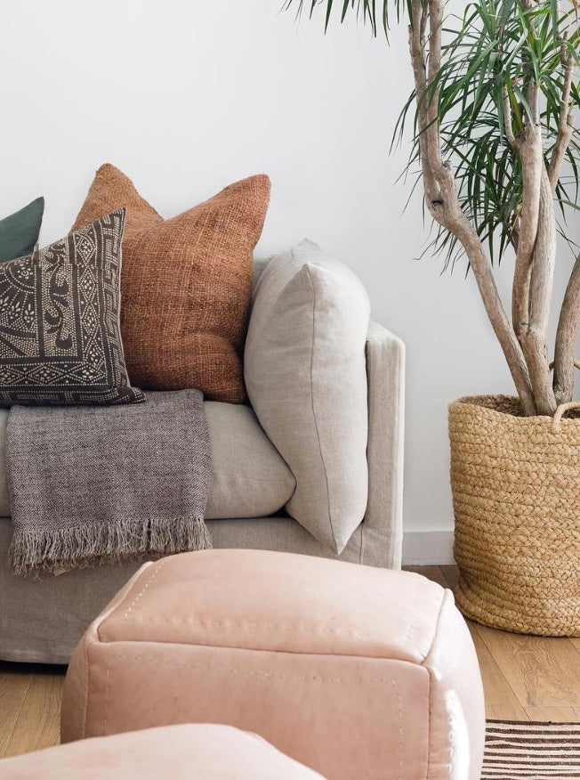 Behind the Design: We partner with artisans in Rwanda who make handwoven platters and baskets using raffia: a straw-like fiber that can be stripped from the inside of palm tree leaves. The fibers are found only in a special species of palm tree that grows abundantly across sub-Saharan Africa. The artisans weave the raffia fibers using a needle and thread, creating a range of shapes, designs, and products that look beautiful in natural raffia tones or when hand-dyed.