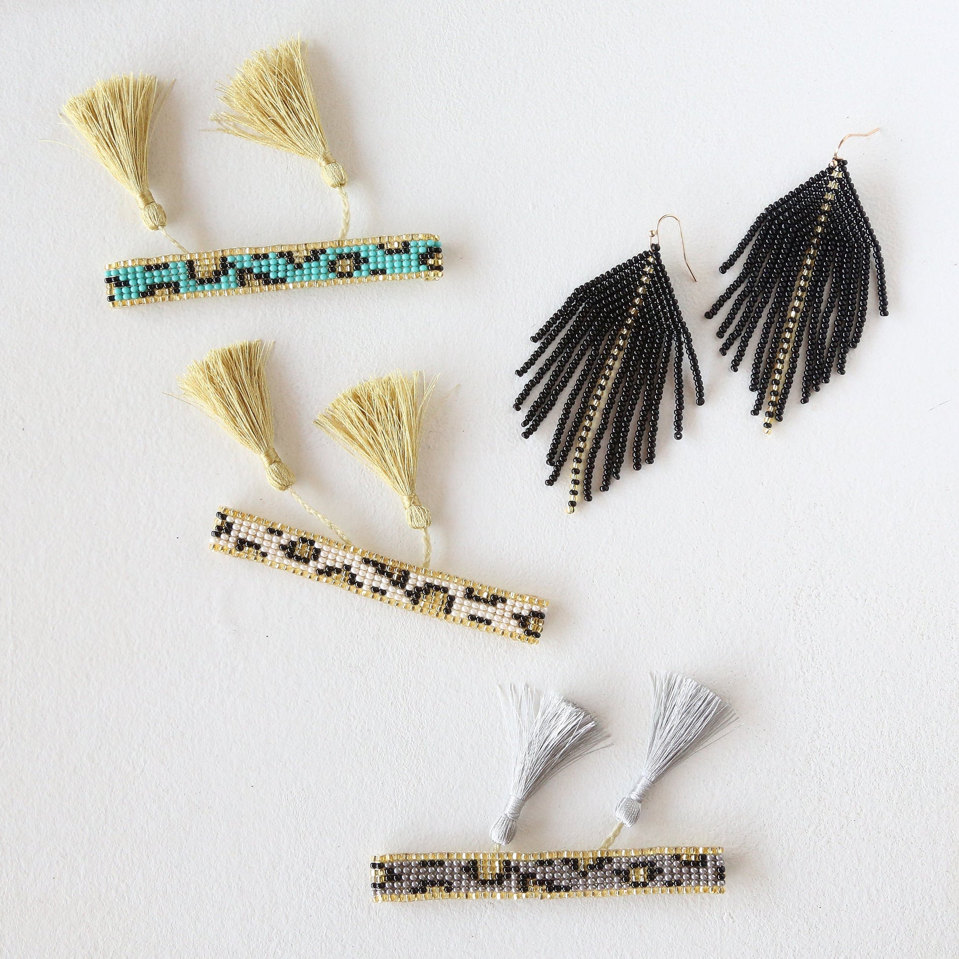 Beaded bracelet with leopard pattern in turquoise, gold and black. Specifications: Adjustable closure - 5 to 9 inches Cuff is 0.5 wide Tassel detail on beaded bracelet SKU #B1009 Pairs well with the Raya Turquoise Earring