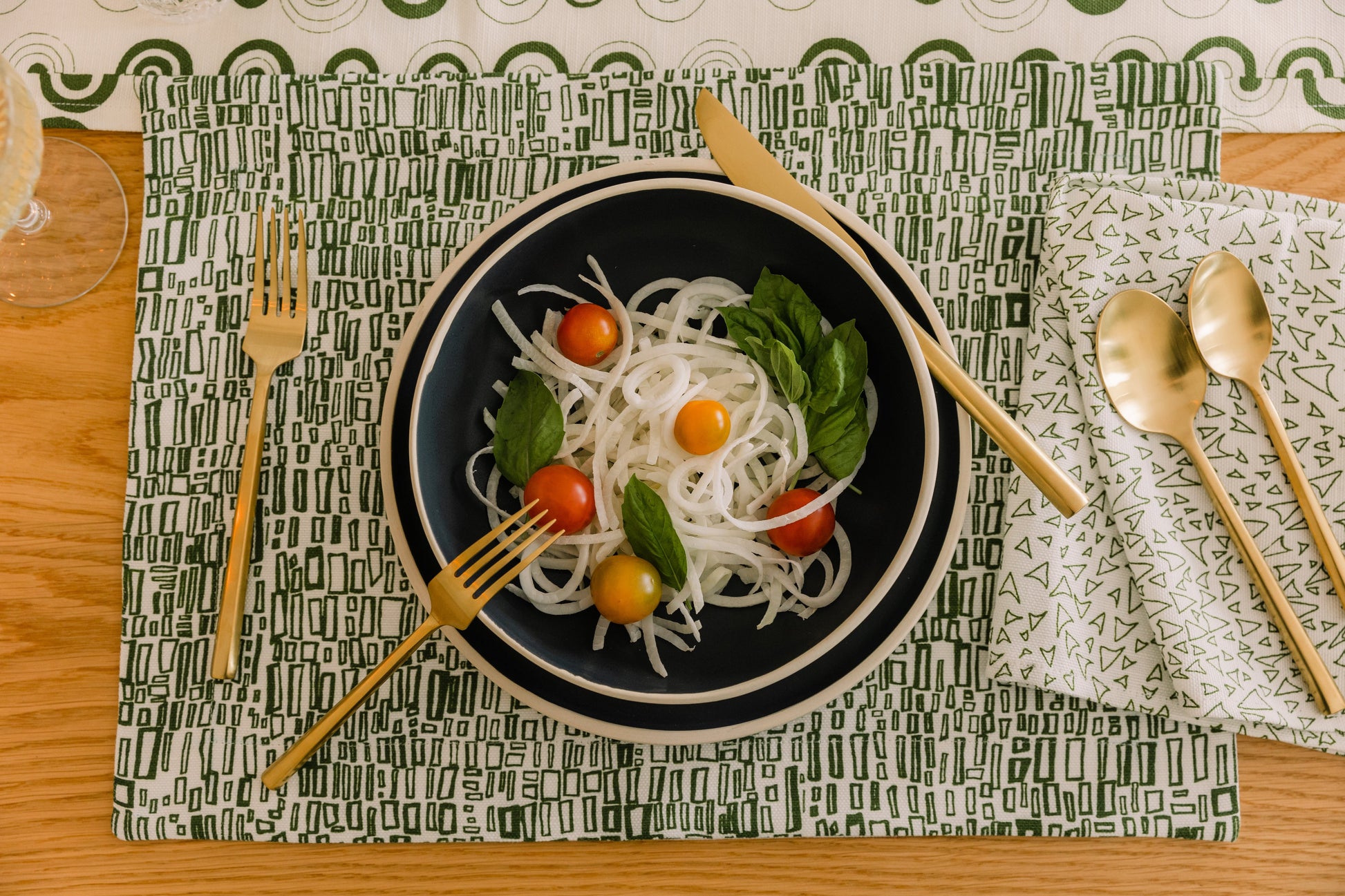 Everything in its place, and mise en place. The Leucadia Placemat in Cereus is a necessary ingredient for every table setting.