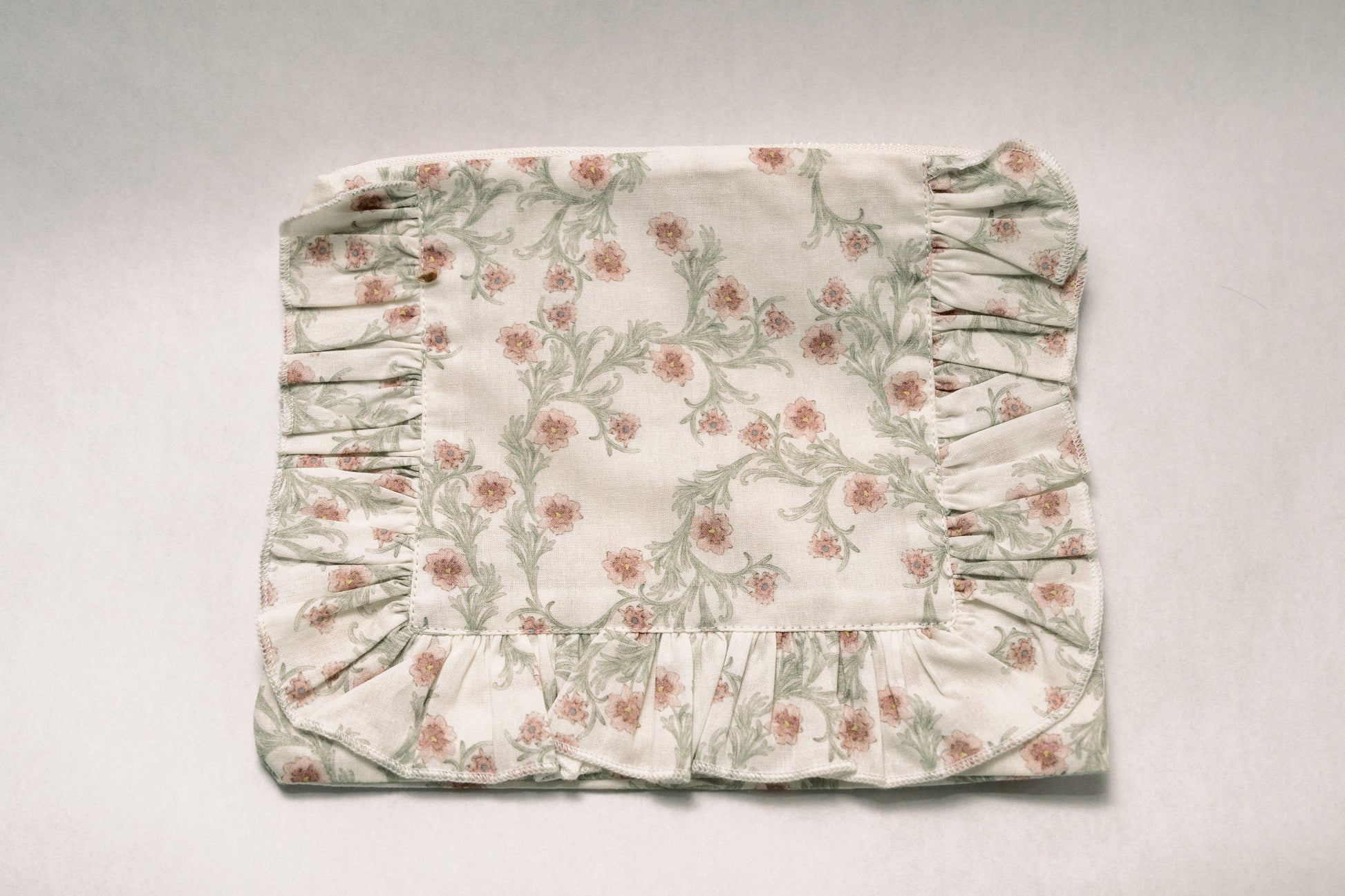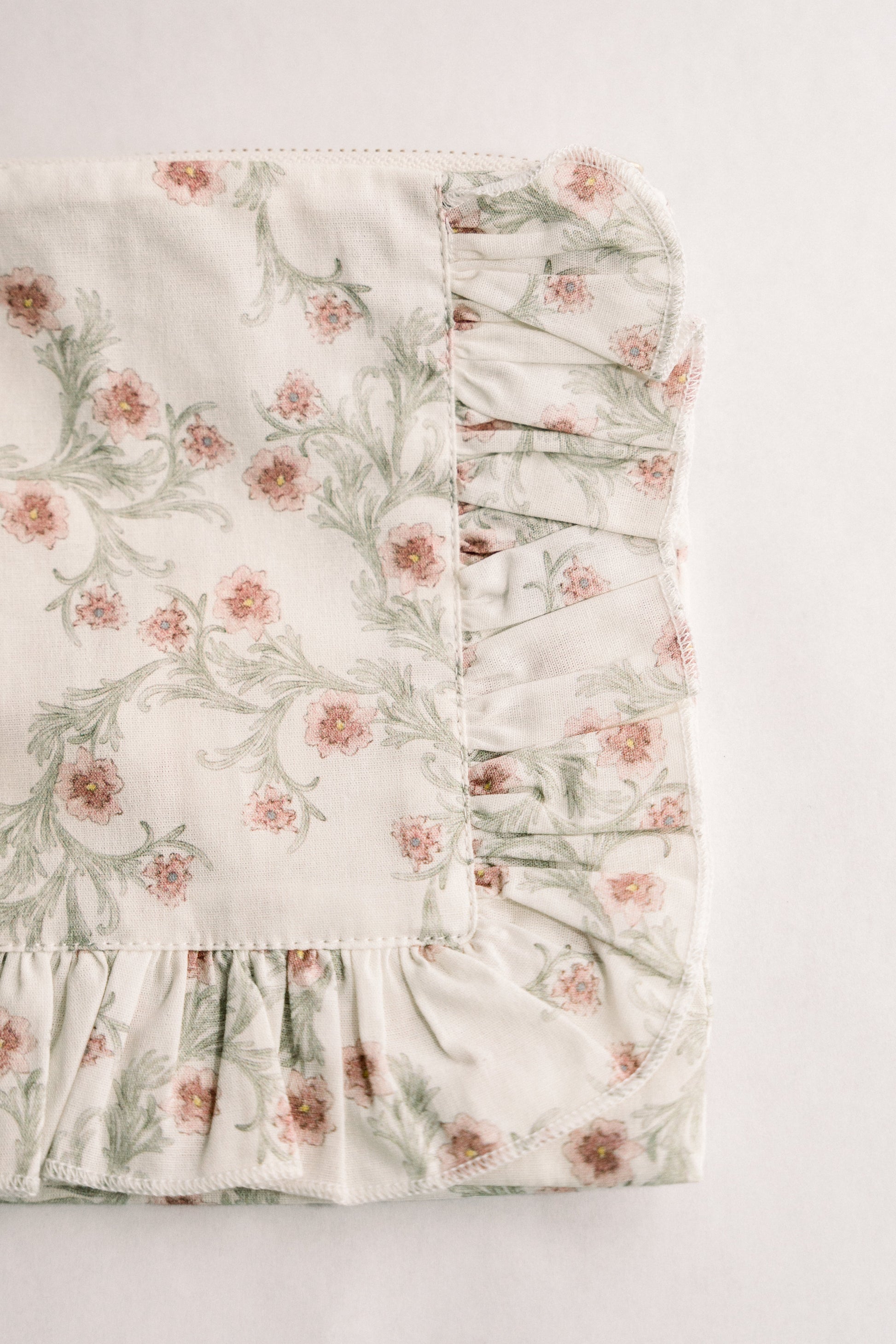 A vintage-inspired pouch in our Lilac Vine Scroll print. Timeless charm meets everyday blooms on sage scrolling vines with a vintage rococo feel. Made from soft cotton fabric in a delicate Lilac-and-Sage floral print, this pouch features romantic ruffle edging and a smooth brass zipper closure. Perfectly sized for keeping little treasures, pacifiers, hair bows, or mama essentials neatly tucked away. Whether you’re tossing it in your diaper bag or using it to store keepsakes, the Lilac Vine Scroll pouch brings a soft touch of nostalgia and beauty to your day. Dimensions: "9.06 × 7.09” Main Fabric: 100% Recycled Cotton Lining: 100% Recycled Cotton Looking for more floral styles? Explore the full Timeless Floral Ruffle Zipper Pouch Collection more than 20 unique prints, all made from recycled cotton with delicate ruffle details you’ll love.