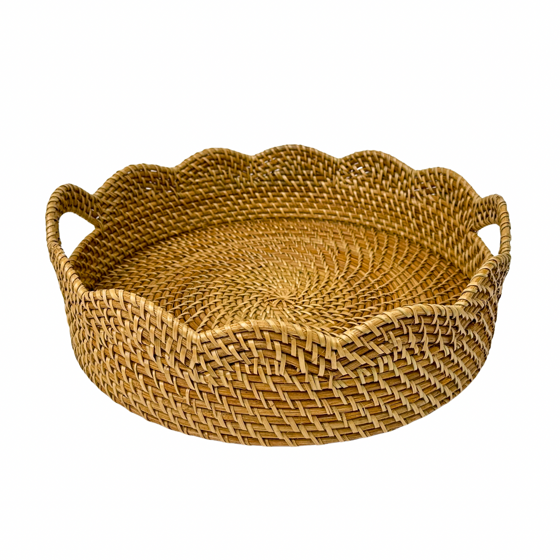 Add a touch of artisanal elegance to your gatherings with the Lily Round Scalloped Rattan Serving Tray. Handcrafted by Filipino artisans, this tray features a stunning scalloped edge design, showcasing the natural beauty of sustainably sourced rattan. Perfect for serving drinks, snacks, or displaying decor, its lightweight yet durable build makes it a versatile addition to your home.