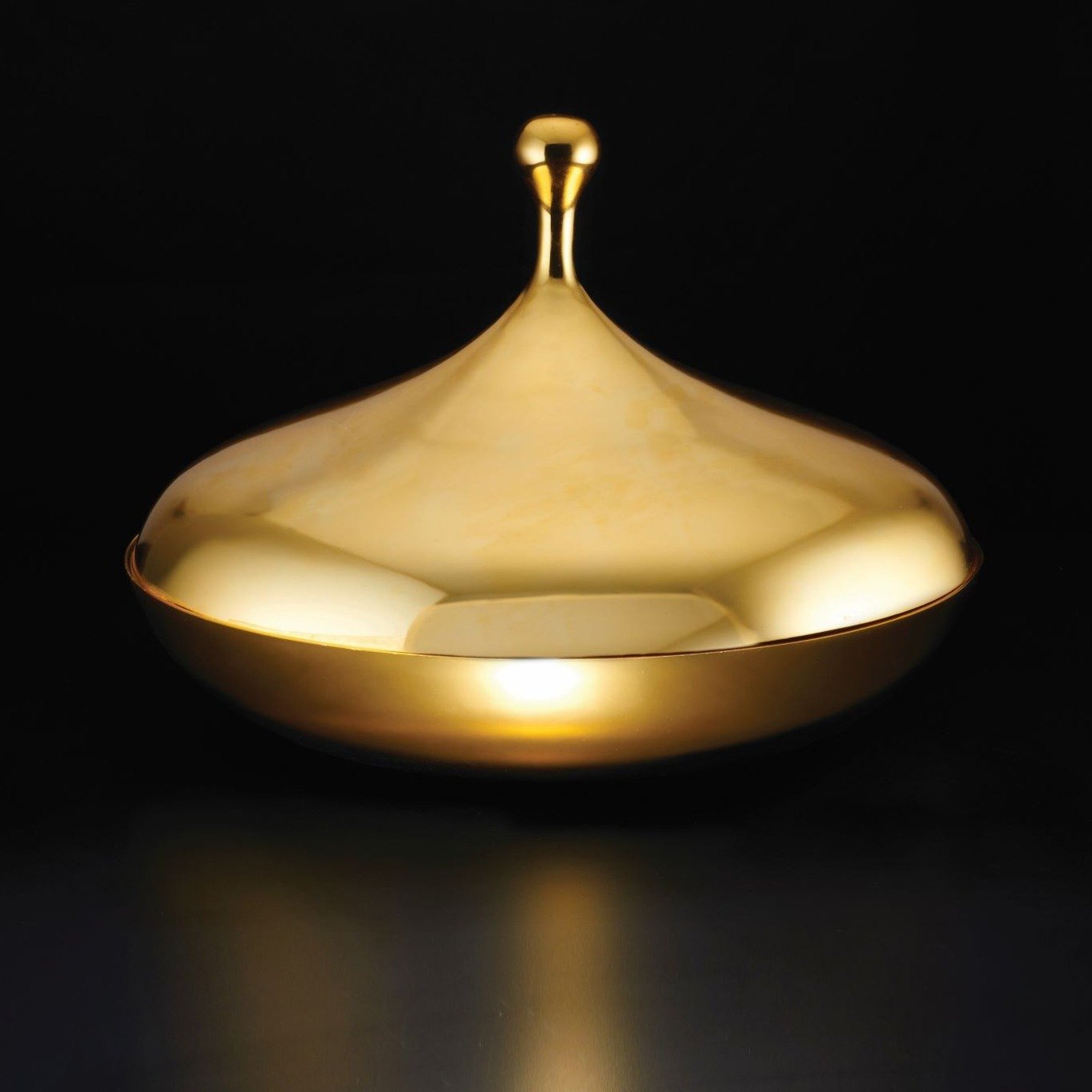 "An ancient vessel, the tajine has stood the test of time because it is the perfect marriage of form and function." Limited Edition - Only 300 made Each of our creations is designed in our San Francisco studio. Master craftsmen using centuries old technique of sand casting create the original mould and skilled artisans hand create every piece, with pride, in our family owned factory. Details Dimensions : 18"L;10"H;18"W Finish : Gold Material : Aluminum Use and Care Given its handmade and hand-finished nature, variations in the piece are to be expected and celebrated. No two pieces are exactly alike. Hand wash with mild soap, water, and towel dry. Do not use abrasives or chemicals to clean the metal as it may scratch and discolor. Not dishwasher safe. Will not tarnish