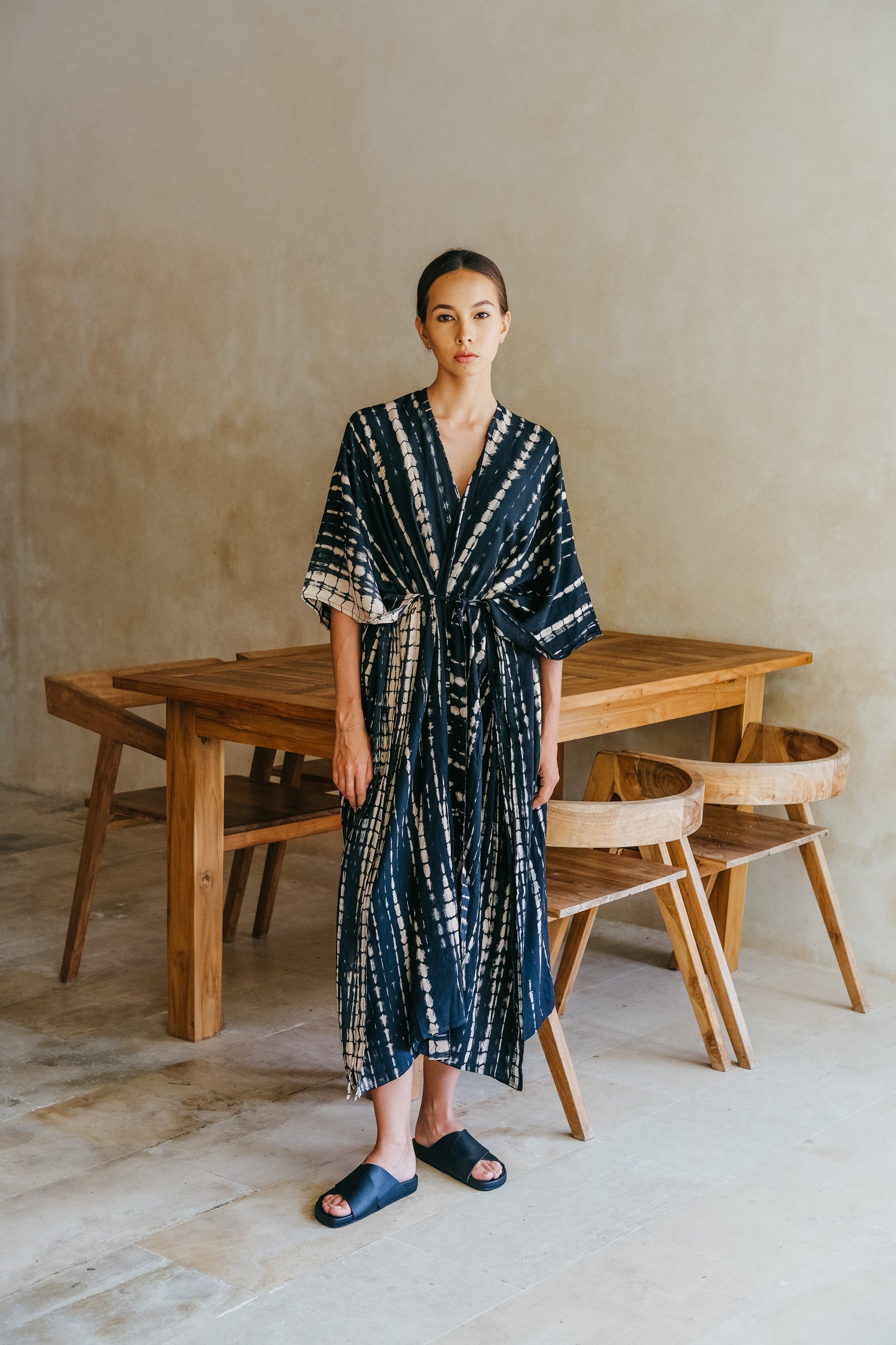 Beautiful and simplistic design perfect for lounging around by the pool or finishing layer, this maxi length kimono features a hand dyed print that's sure to elevate any outfit. Come with a matching belt that help you easily change to different looks throughout the day. This one-size-fits-most approach will flatter many figures with our everchanging style. The looseness of this Kimono allows the wear to feel comfortable without feeling constricted. The length of the kimono gives the wearer a look of elegance while being traditional. We are using a traditional hand tie-dyed process on our fabric. Therefore, no one outfit is exactly alike. We created garments that are meant to last season after season. Each garment is carefully tailored made by our small team of women artisans from the comfort of their own homes. Our model is 5’7" Size S and is wearing One Size. Lay flat measurement: Shoulder to hem 50”. Long Length. Come with a matching belt. Handwash cold. Lay flat to dry. 100% Rayon. Handmade with love. Shipping & Returns: Return accepted for store credit only. Please see our Shipping & Returns page for more details.