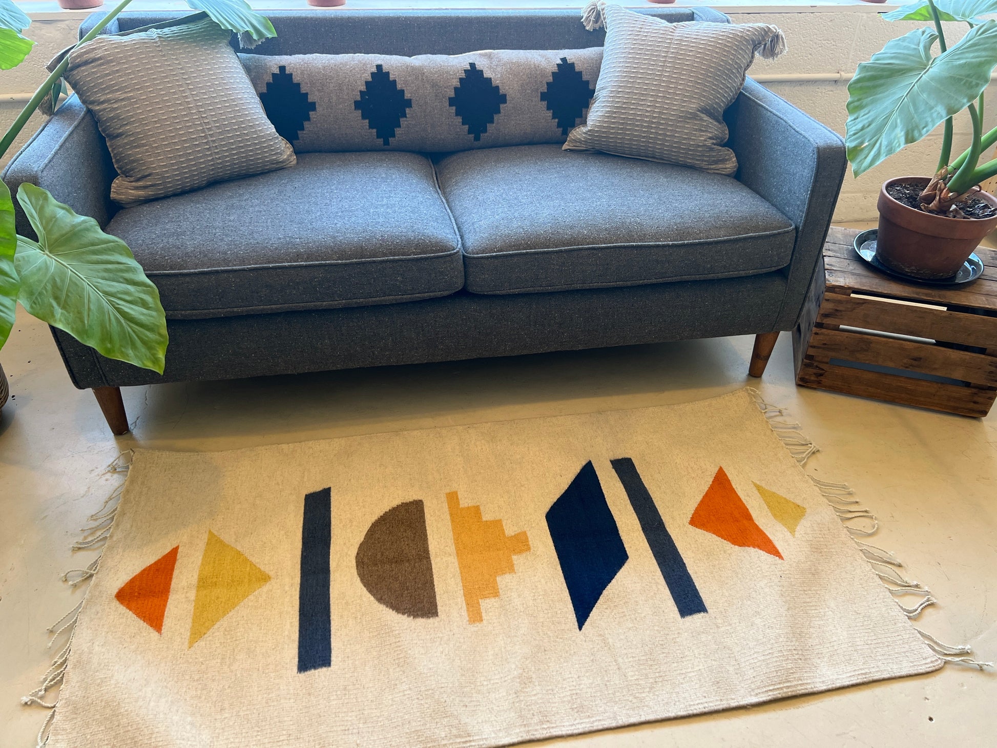 PLEASE NOTE: Only 3'x5' rug is ready to ship in this design. All other sizes will be made to order. 100% wool flat weave rug or wall hanging Woven using traditional heritage craft methods, on foot pedal looms by master Zapotec weavers NOTES: * Made-to-order Weaving will begin as soon as you place your order * Production time is generally 9-12 weeks, with updates via email **Contents** * 100% natural sheep's wool, dyed using plant based natural dyes * Natural dye batches are individually created for each weaving, & may vary slightly from the photo example * Please note that due to their handmade nature, pieces may have unique characteristics or small irregularities **Care/Import** * Spot Clean or Dry Clean * Ships from Asheville, NC, woven in Mexico **Dimensions** * We stock standard sizes of 2' x 3', 3' x 5', 4' x 6', 6 x 9', 8' x 10', 9' x 12' and 2.5' x 8' Runners * All rugs are made-to-order & can be customized to your preference of size & colors * Feel free to reach out for details or with any questions - See a style you like, but need it in another size or color? Contact info@loomimports.com * We also offer custom commissions of your own original art or design!