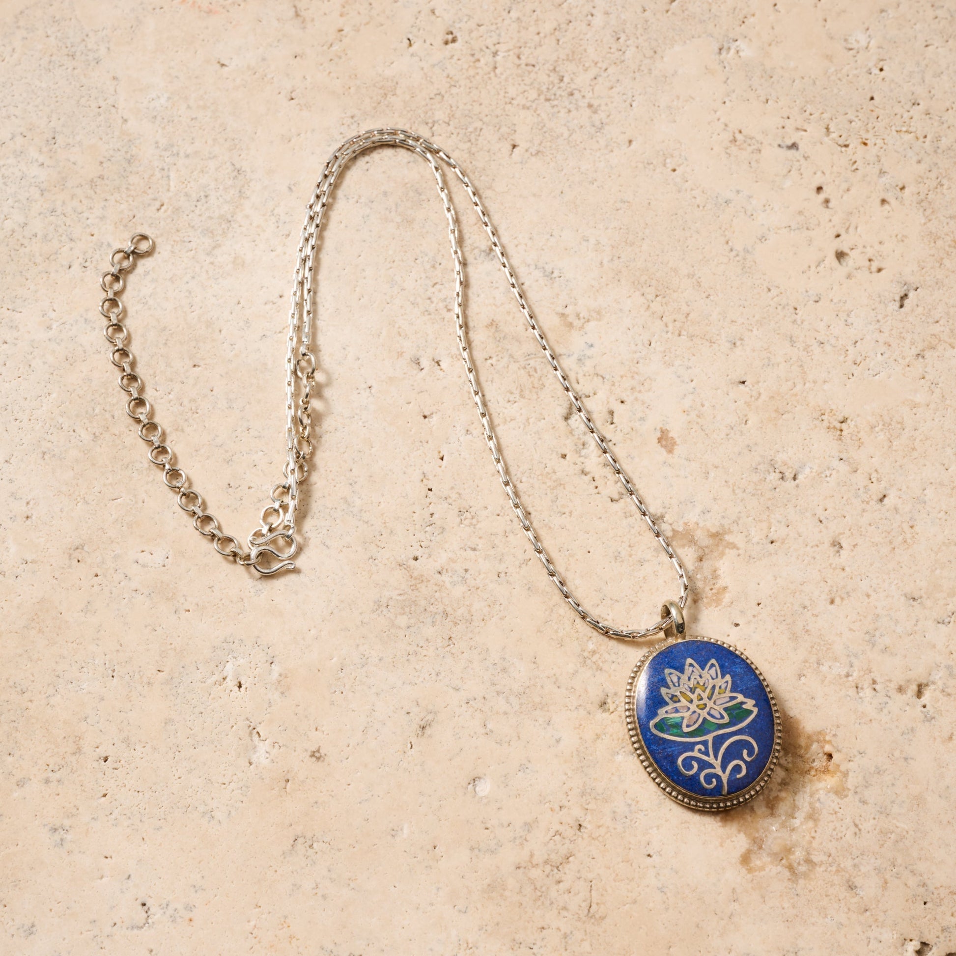Add a touch of unique beauty to your look with this beautiful necklace. The intricate lotus design is crafted with white metal and filled with powdered stone in vibrant malachite and lapis. Featuring an adjustable chain and S clasp closure for easy wear, this versatile piece is a stylish addition to any outfit! A Ten Thousand Villages Exclusive handcrafted in Nepal.