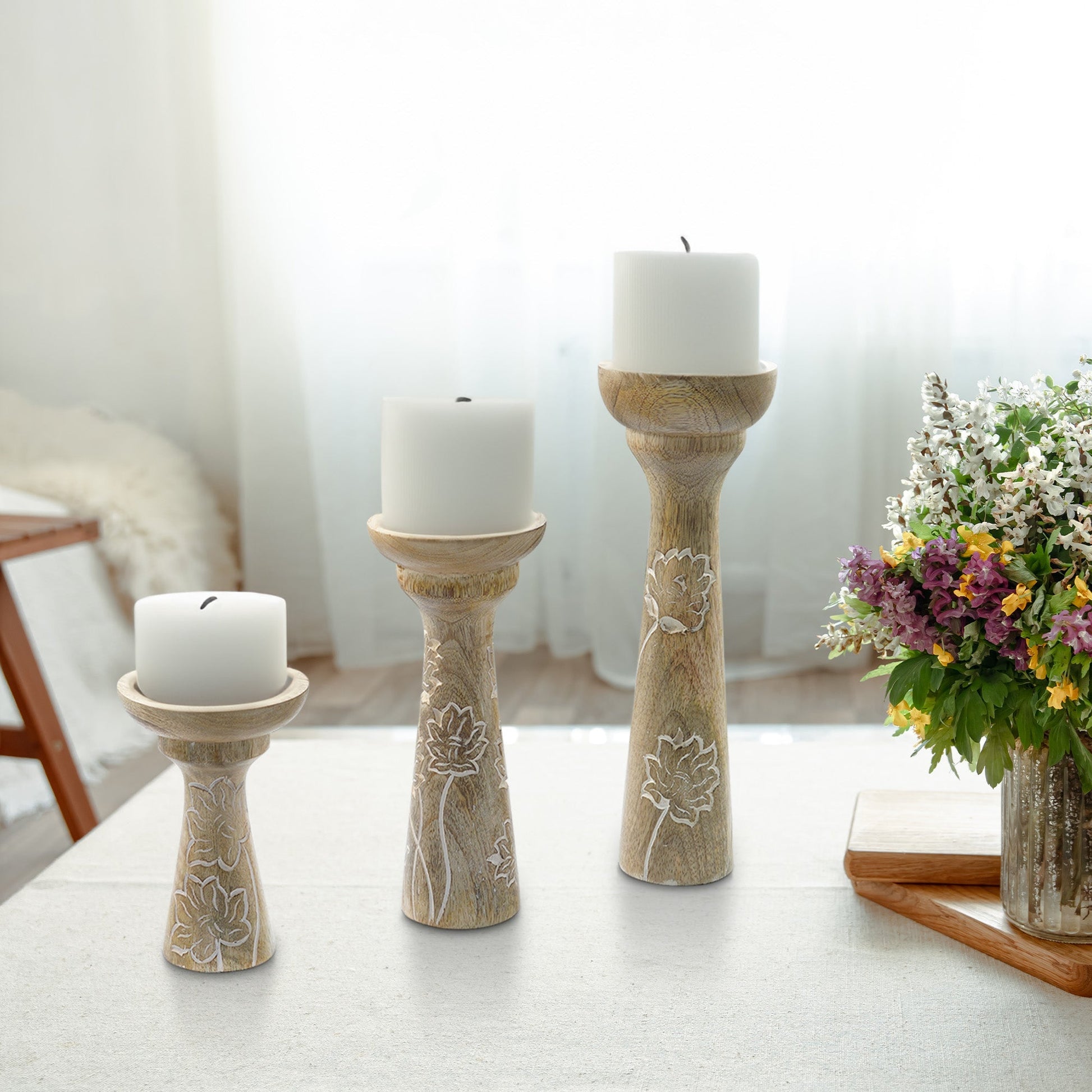 Bathe your home in a soft, natural glow with our Candleholder Set, delicately carved with a lotus vine motif. Add rustic charm that blends seamlessly with both modern and traditional décor. Small – 4" Diameter x 6" Height Medium – 4.5" Diameter x 9" Height Large – 5" Diameter x 12" Height