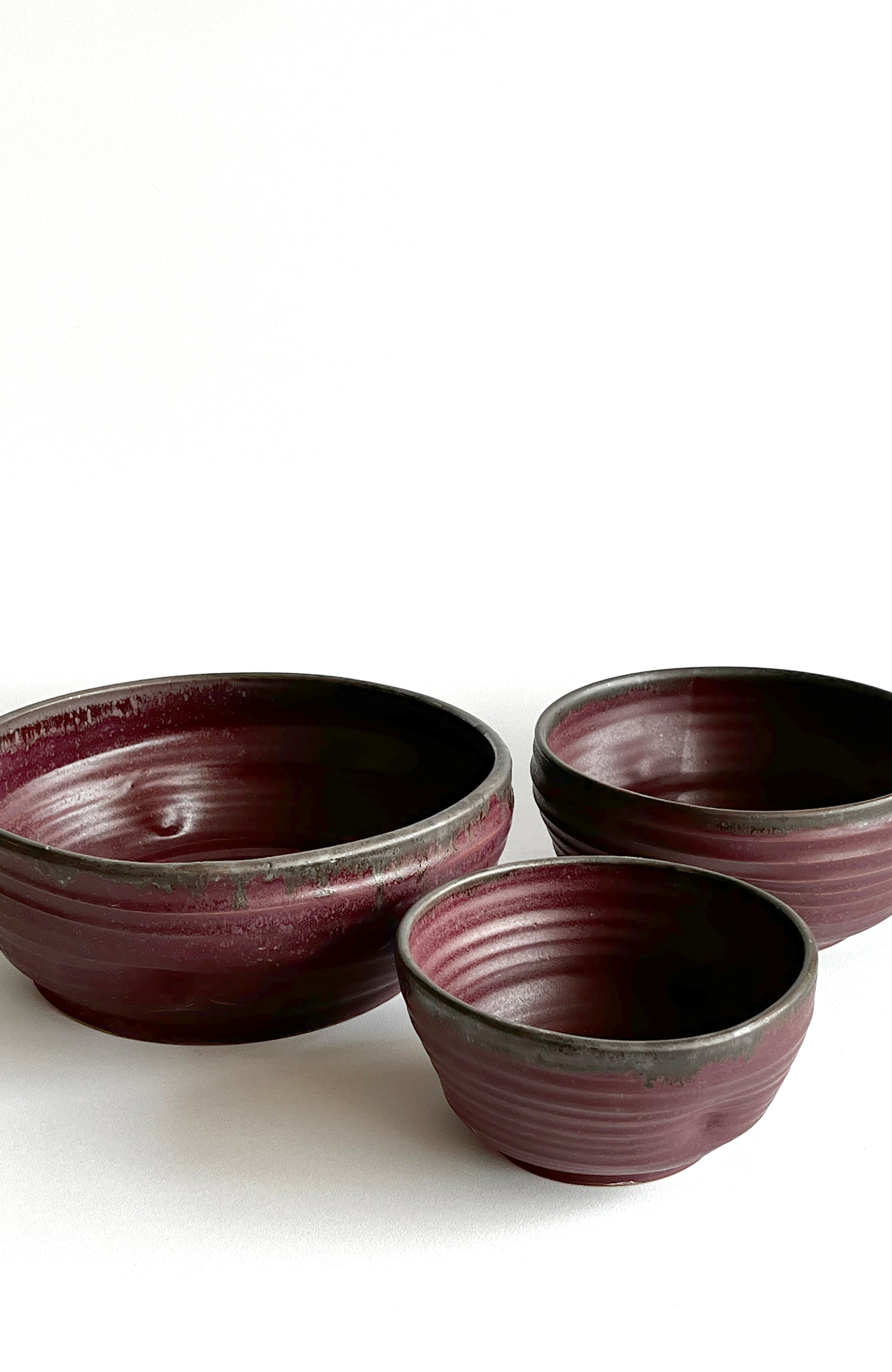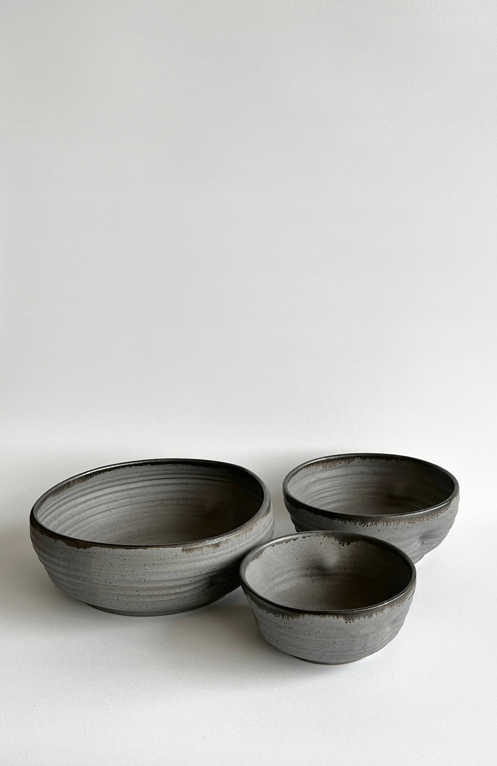 The Luna Nesting bowls are available for purchase as a set or individually. With three varying sizes, they can cater to all your serving necessities. Measuring around 5, 7, and 9 inches in diameter, each boasts throw marks and finger indentations for a natural, imperfect look. These bowls are meticulously fashioned to withstand microwaves and dishwashers. *All of my products are made by hand and will vary. Each glaze firing varies as well. Please keep this and my refund policy in mind when you place your order. Thank you.