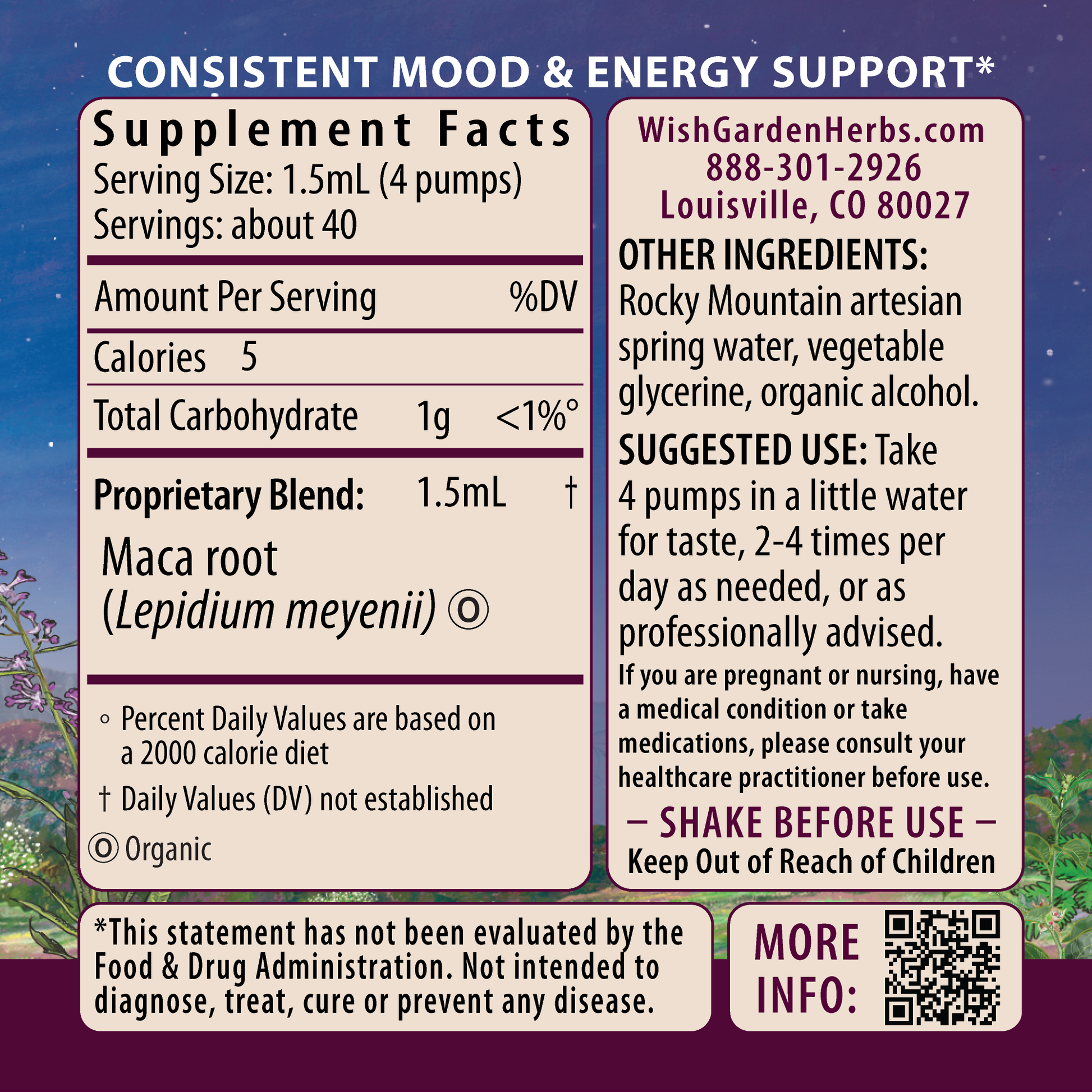 Maca root (Lepidium meyenii), Rocky Mountain artesian spring water, vegetable glycerine & organic gluten-free alcohol.