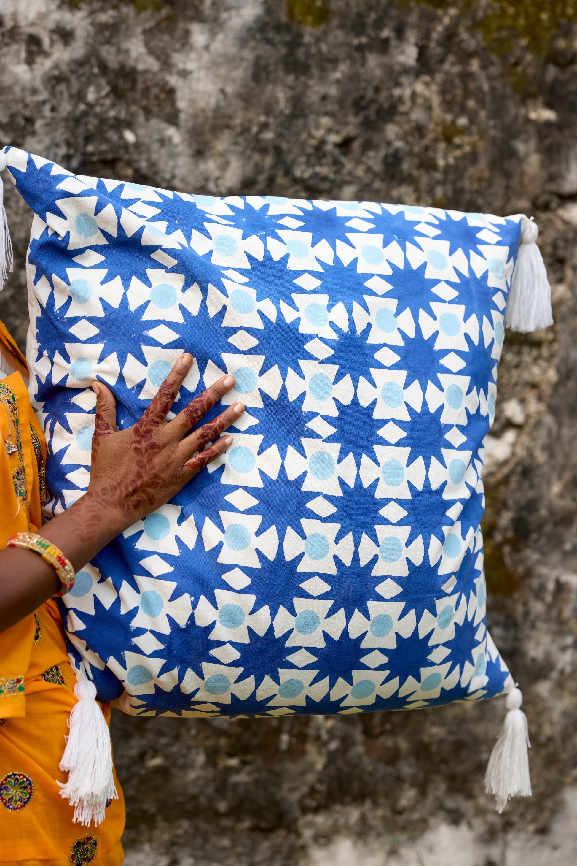 Turn over the Magic Hour quilt to reveal a stunning reverse side adorned with a vibrant blue starburst pattern. Each meticulously hand-block printed star creates a striking, celestial-inspired design that celebrates traditional craftsmanship with a modern twist. Perfectly reversible, this quilt offers two distinct looks, making it a versatile addition to any space. The design is hand-pressed onto each quilt using hand-carved wooden blocks dipped in dyes. The printed cotton shells are brought to the homes of quiltmakers, who stuff and stitch the quilts by hand, creating the final product. Our quilts are made in small batches. Due to the handcrafted nature of this item, expect slight variations in the appearance of each unique piece. - 100% cotton voile exterior - 100% cotton stuffing - Made in India - Ships from California - Queen size: 96″ x 96″ - King size: 108″ x 108″ - Sham size: 26″ x 26″