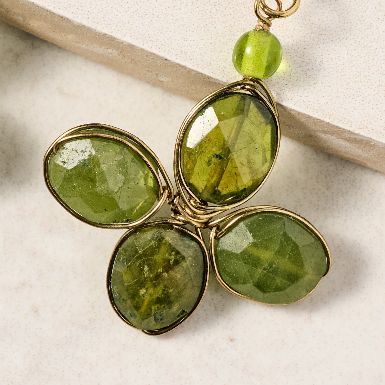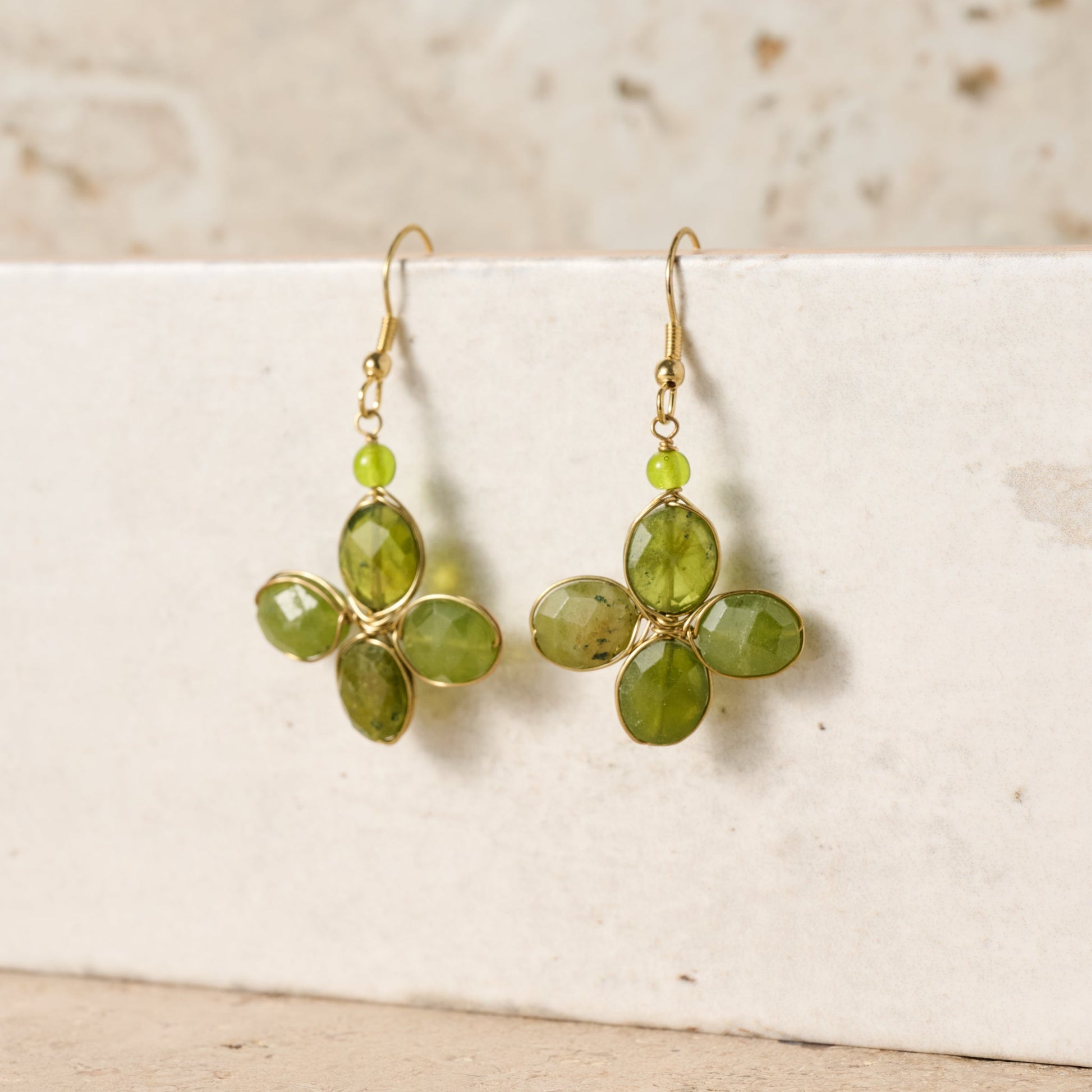 Add a touch of nature-inspired charm with these striking earrings, featuring Vessonite stone beads in a clover-like design. Four vibrant green stones are delicately wrapped in gold-toned wire and finished with a soft green accent bead and gold ear hook. An elegant blend of earthy and radiant. A Ten Thousand Villages Exclusive handcrafted by the artisans of Tara Projects (India) Limited, an organization dedicated to practicing fairness in its production and trading activities for the development of grassroots and marginalized sections of society.