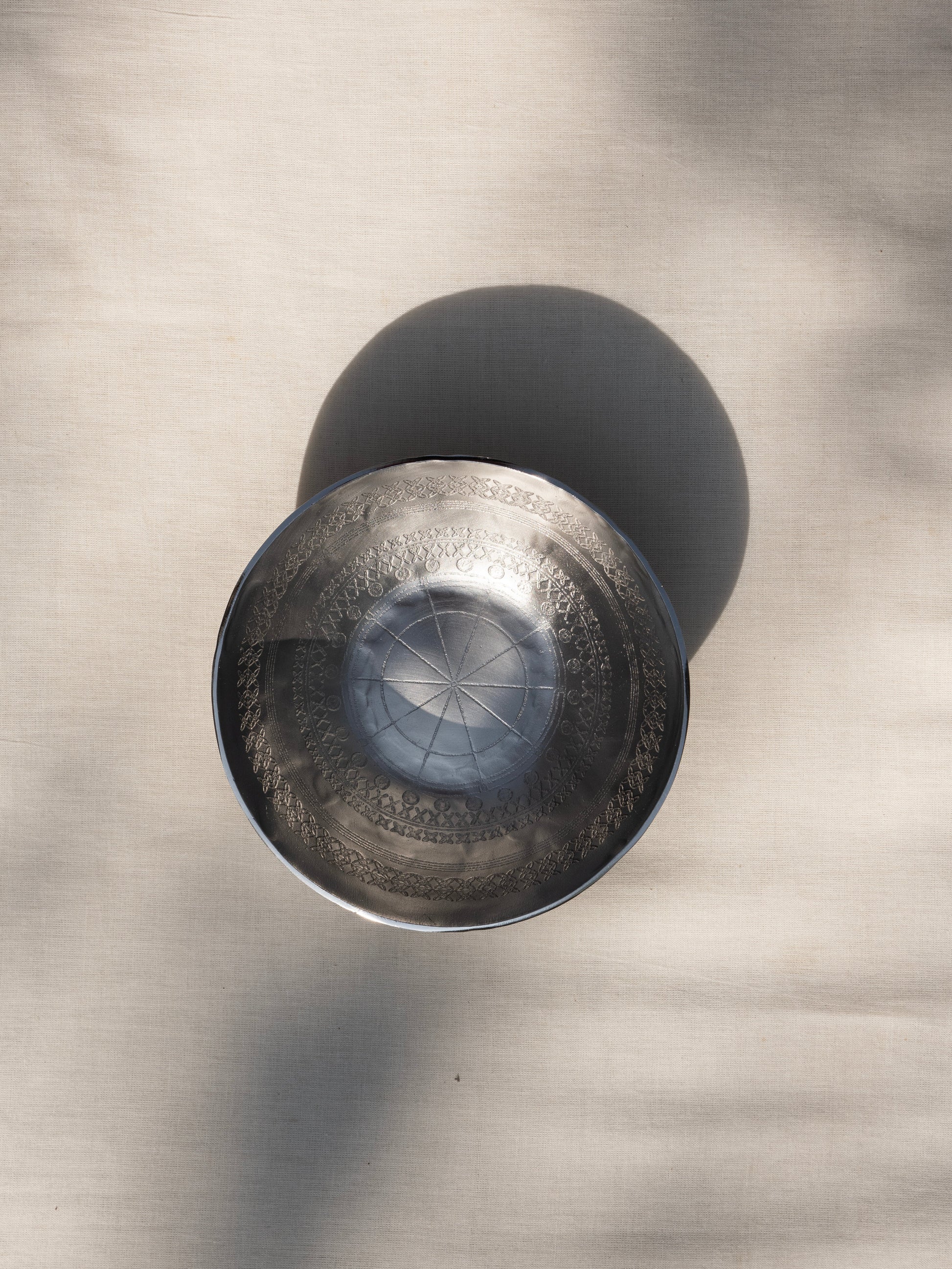 Experienced craftsmen begin with thin sheets of aluminum to create this set of unique nickel-plated serving bowls. Each piece is then embellished with intricate patterns etched by hand into its satin finish, creating a focal point. Serving sets are sized in a range for everyday use to hold fruit or present snacks.