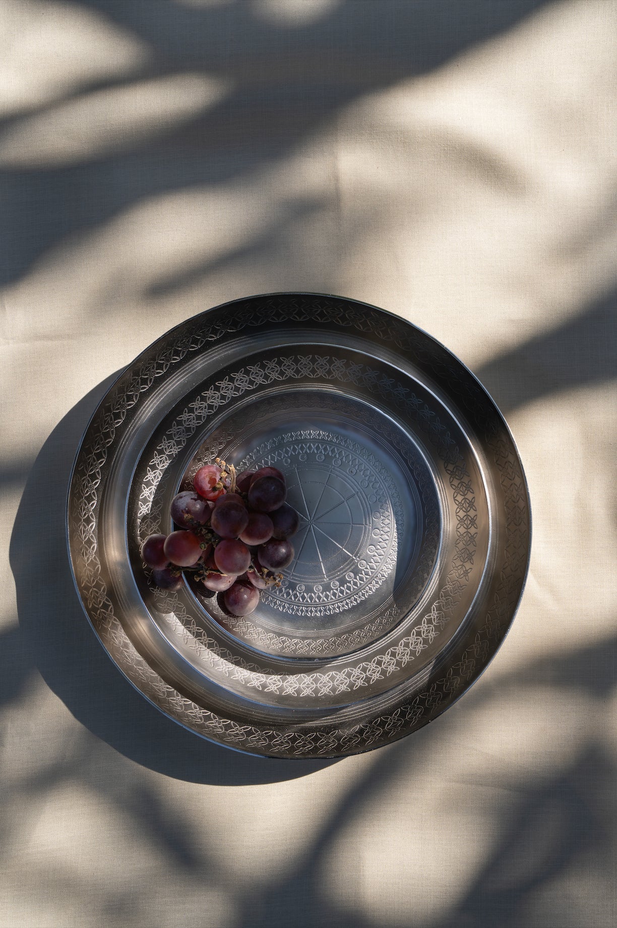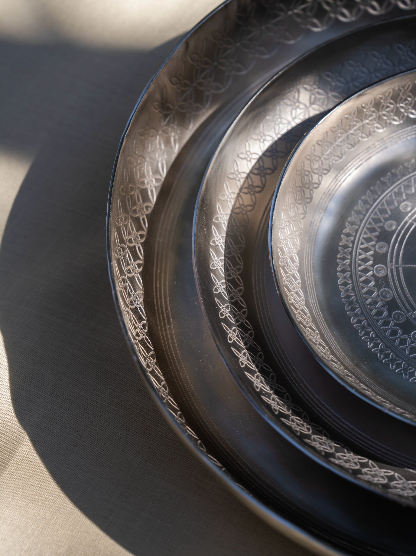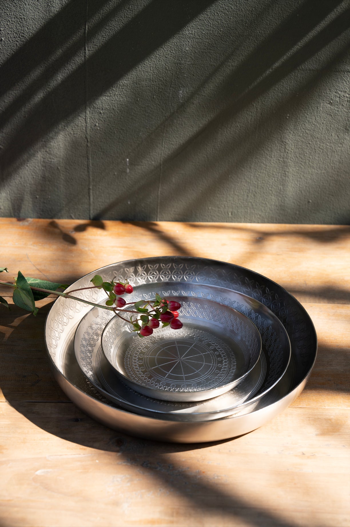 Experienced craftsmen begin with thin sheets of aluminum to create this set of unique nickel-plated serving trays. Each piece is then embellished with intricate patterns etched by hand into its satin finish, creating a focal point. Serving sets are sized in a range for everyday use to hold fruit, deliver drinks, or present snacks.