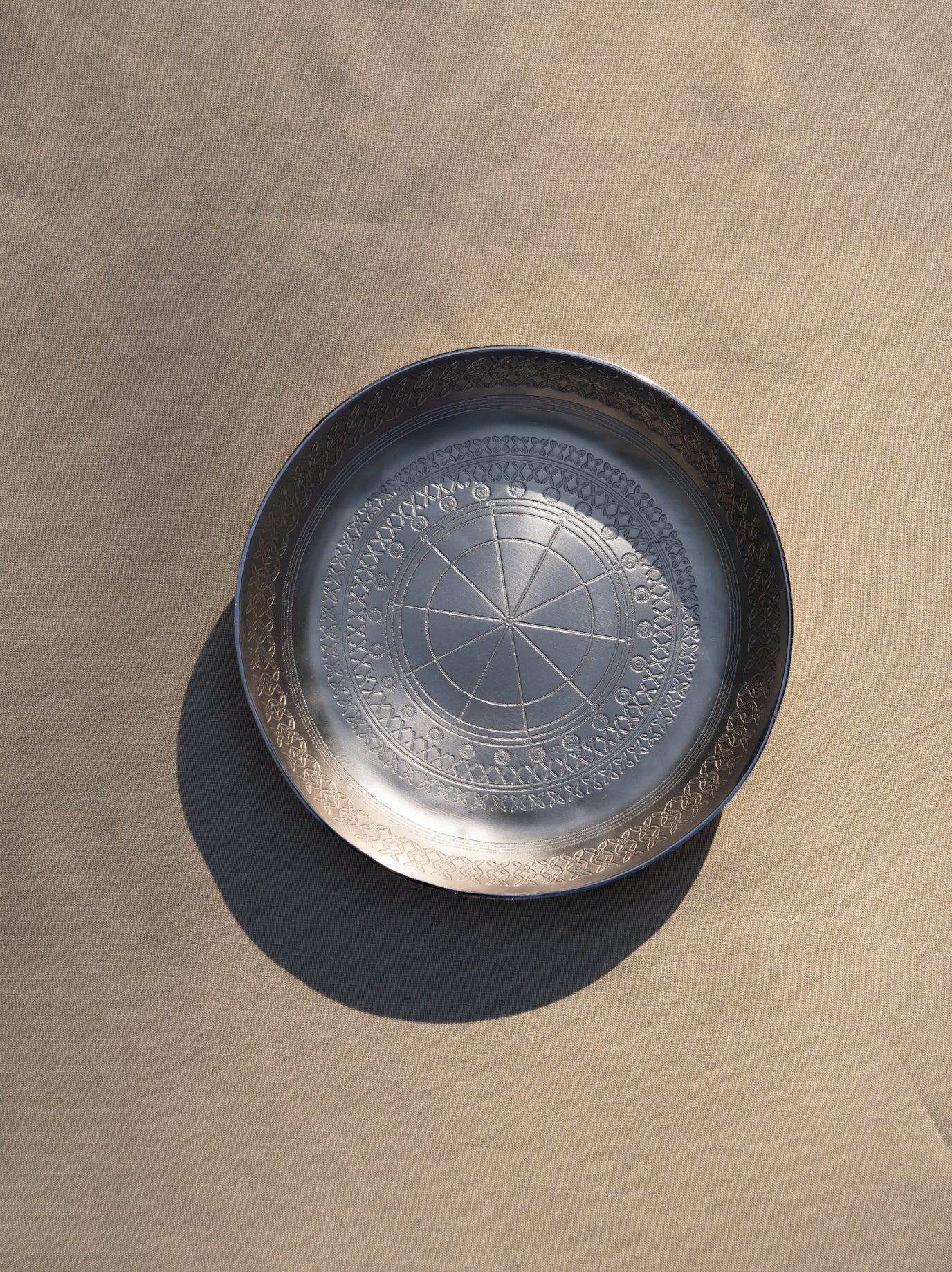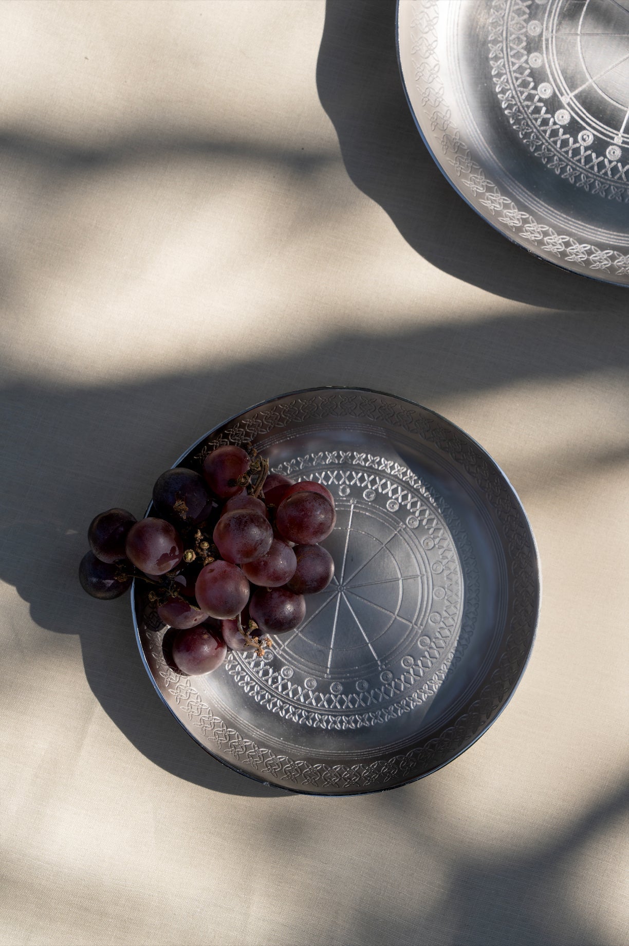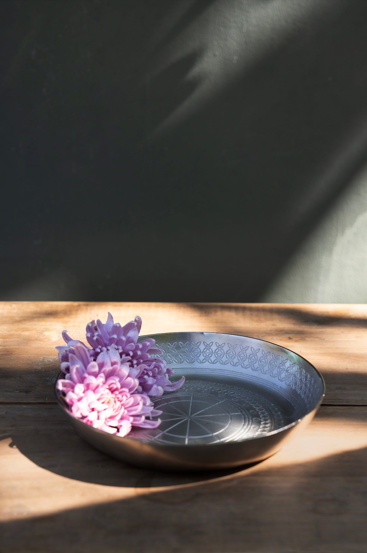 Experienced craftsmen begin with thin sheets of aluminum to create this set of unique nickel-plated serving trays. Each piece is then embellished with intricate patterns etched by hand into its satin finish, creating a focal point. Serving sets are sized in a range for everyday use to hold fruit, deliver drinks, or present snacks.