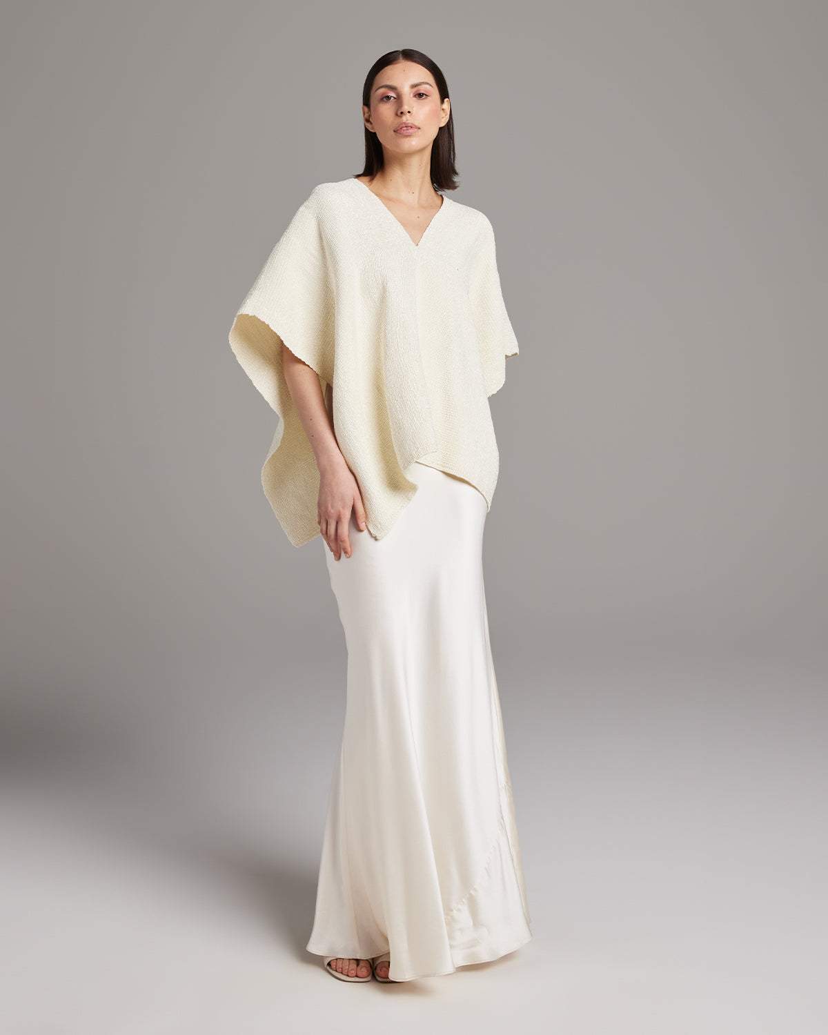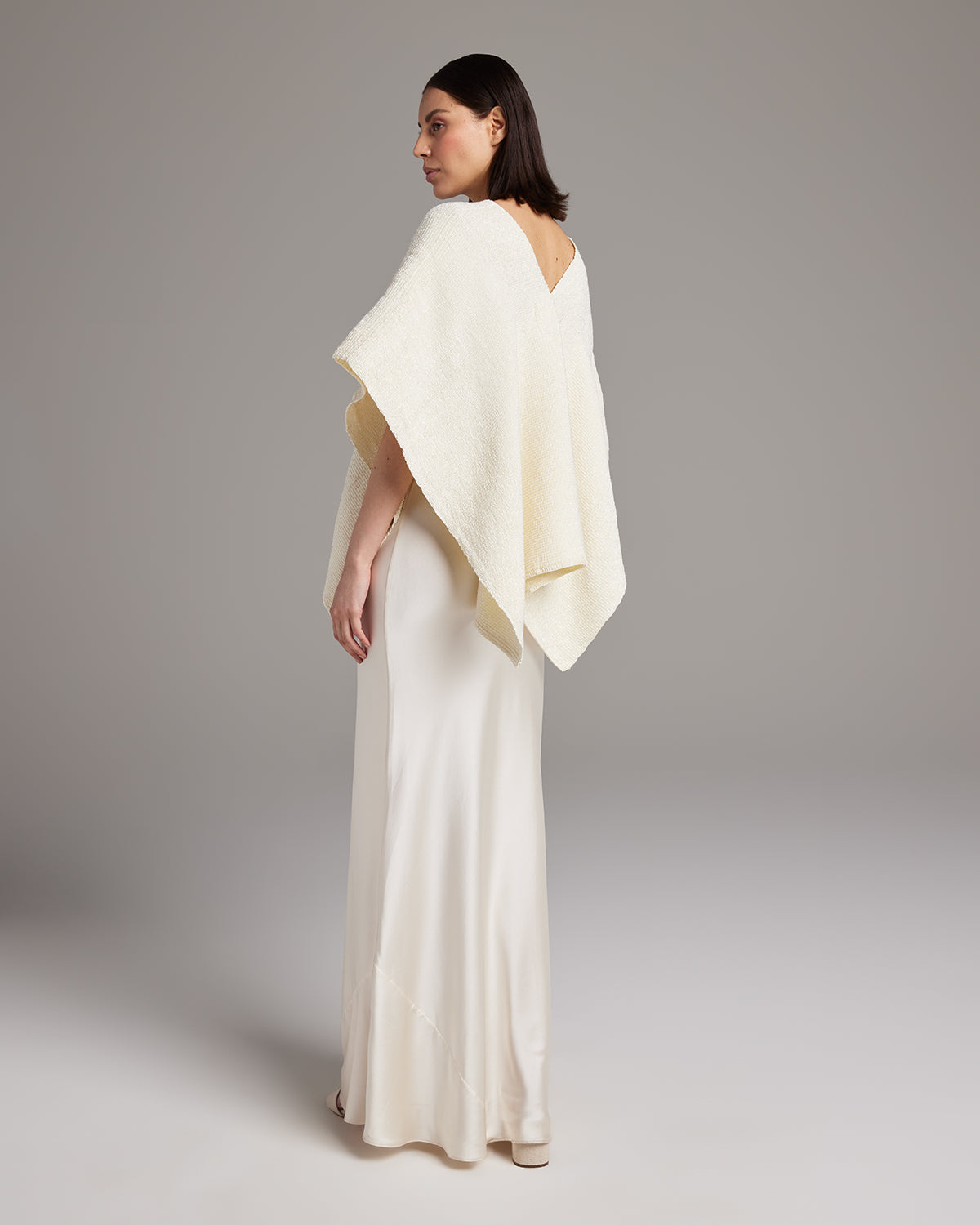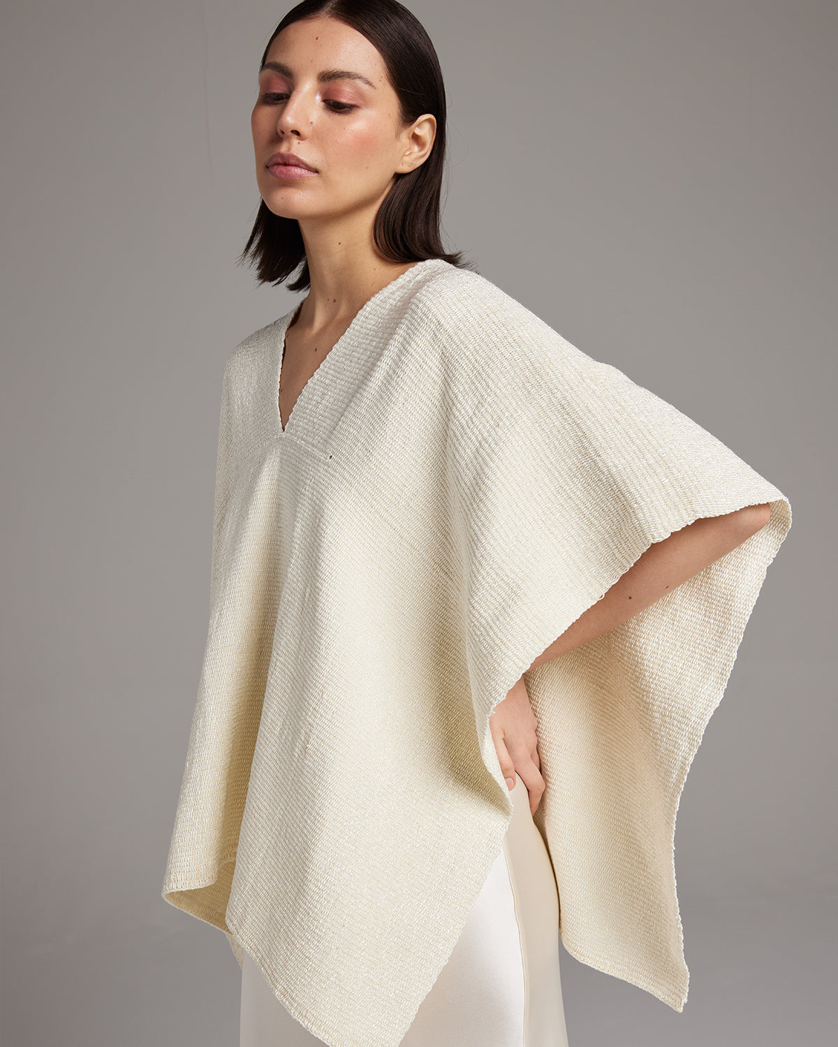 The Manta Captiva is a simple statement piece with a unique and subtle glow. Every yarn of Captiva yarn in the Manta, or "short poncho," has a luminous sheen and unique texture. 100% Handwoven Cotton Made in Southern Chile