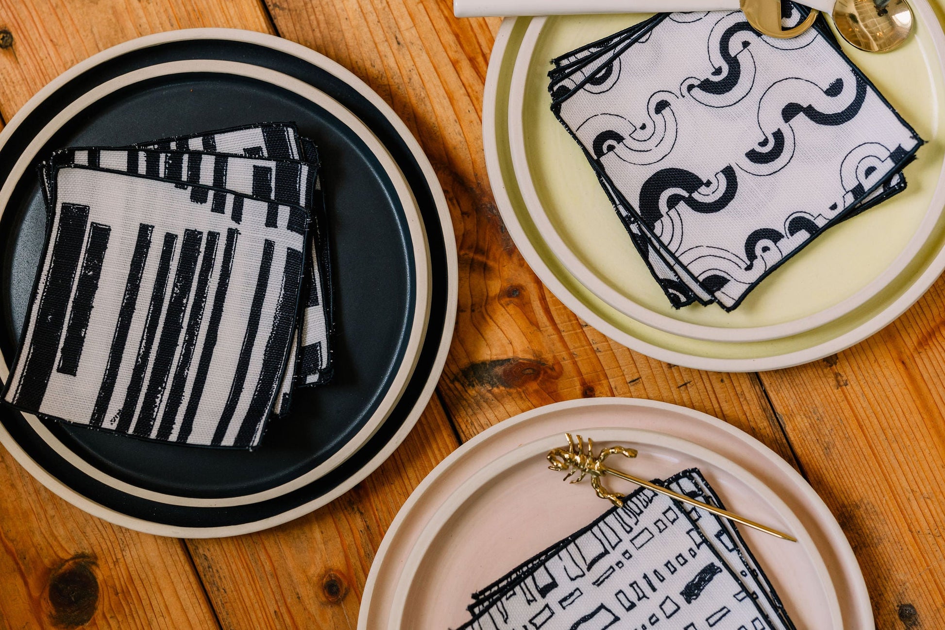 Better together. This artful and graphic cocktail napkin set, born from an imaginative brainstorm in sustainable problem solving, is sure to elevate any and every weeknight or weekend affair.