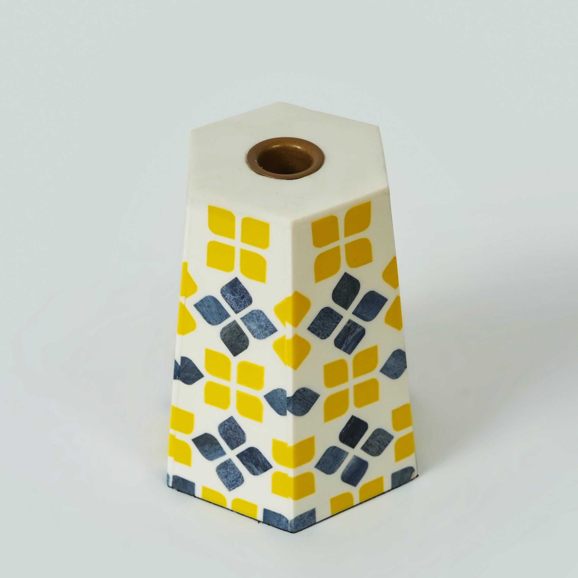 A warm glow meets timeless craft in this handcrafted candleholder, adorned with a vibrant marigold mosaic in bone and resin. Set on a sturdy wood base and made by skilled Indian artisans, it brings heritage elegance and soft radiance to any modern setting. Part of our exquisite Marigold Mosaic décor collection.