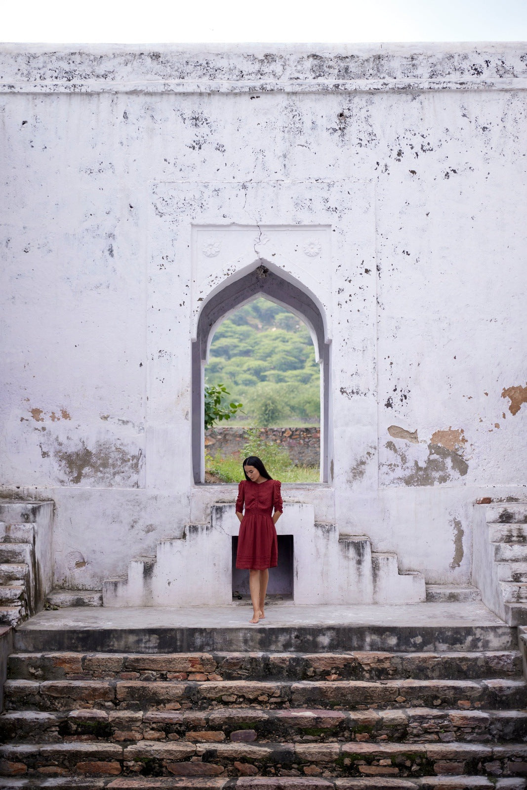 The Martine Dress is the perfect dress for date nights and weekend drinks. Made with delicate Georgette fabric, the ruched shoulders and deep rouge color create a dramatic effect. - 100% Georgette - Cotton lining - Elastic waist - Made in India - Ships from California