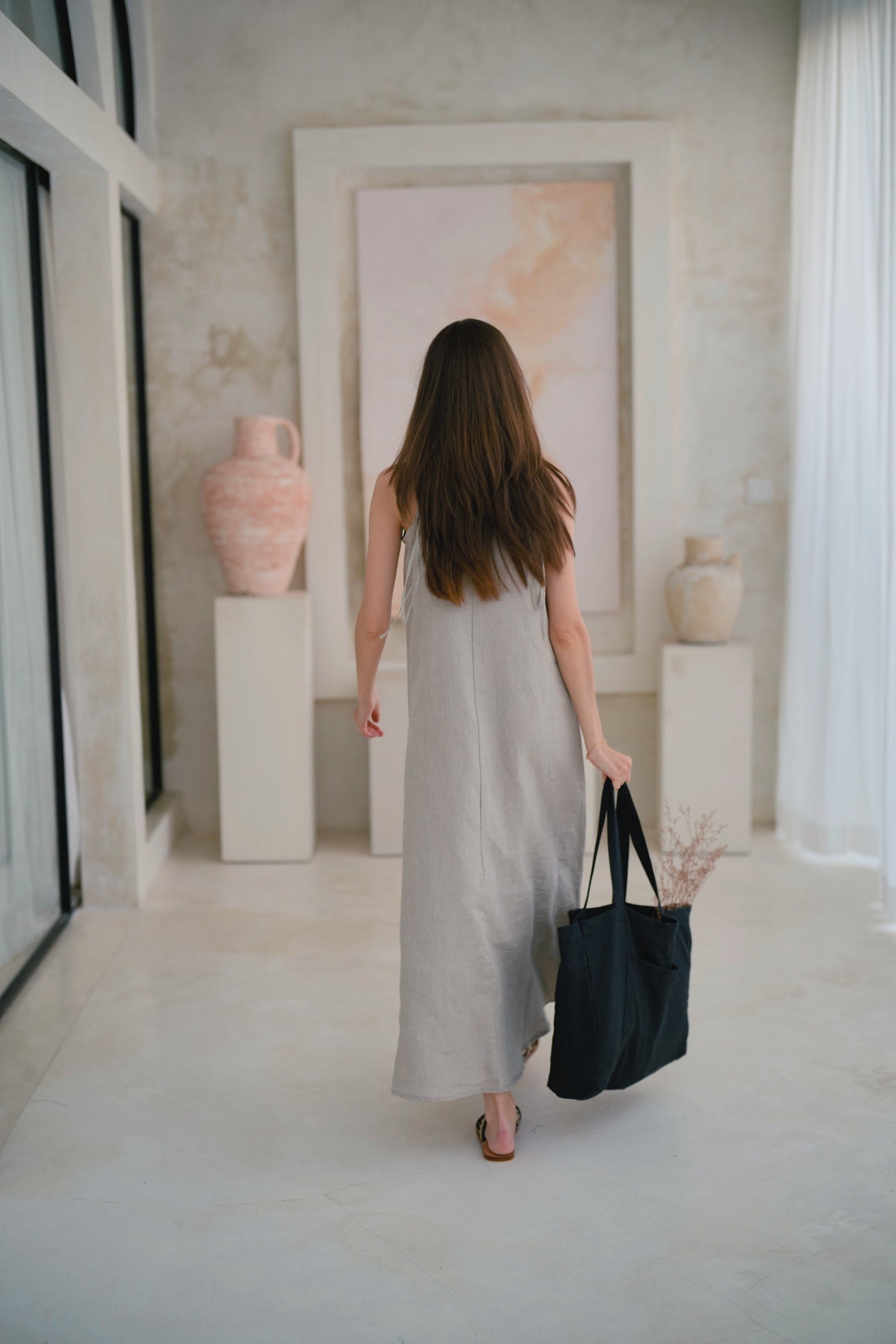 So stunning and effortlessly chic style, this solid maxi dress is the perfect throw-on-and-go style. With our made-to-order approach, every piece is created by need which allows our talented artisans to take their time to focus on every detail. Every tailor-quality garment is specifically made specially for you. Every stitch is meant to keep our artisans craftsmanship culture alive. Our model is 5‘7” Size S and is wearing XS. Dress length measurement: 46”/ 117cm. Bust: XS 33”/84cm, S/M 36”/92cm and L/XL 39”/100cm. Hand wash cold. Lay flat to dry. 100% linen. Shipping & Returns: Return accepted for store credit only. Please see our Shipping & Returns page for more details.