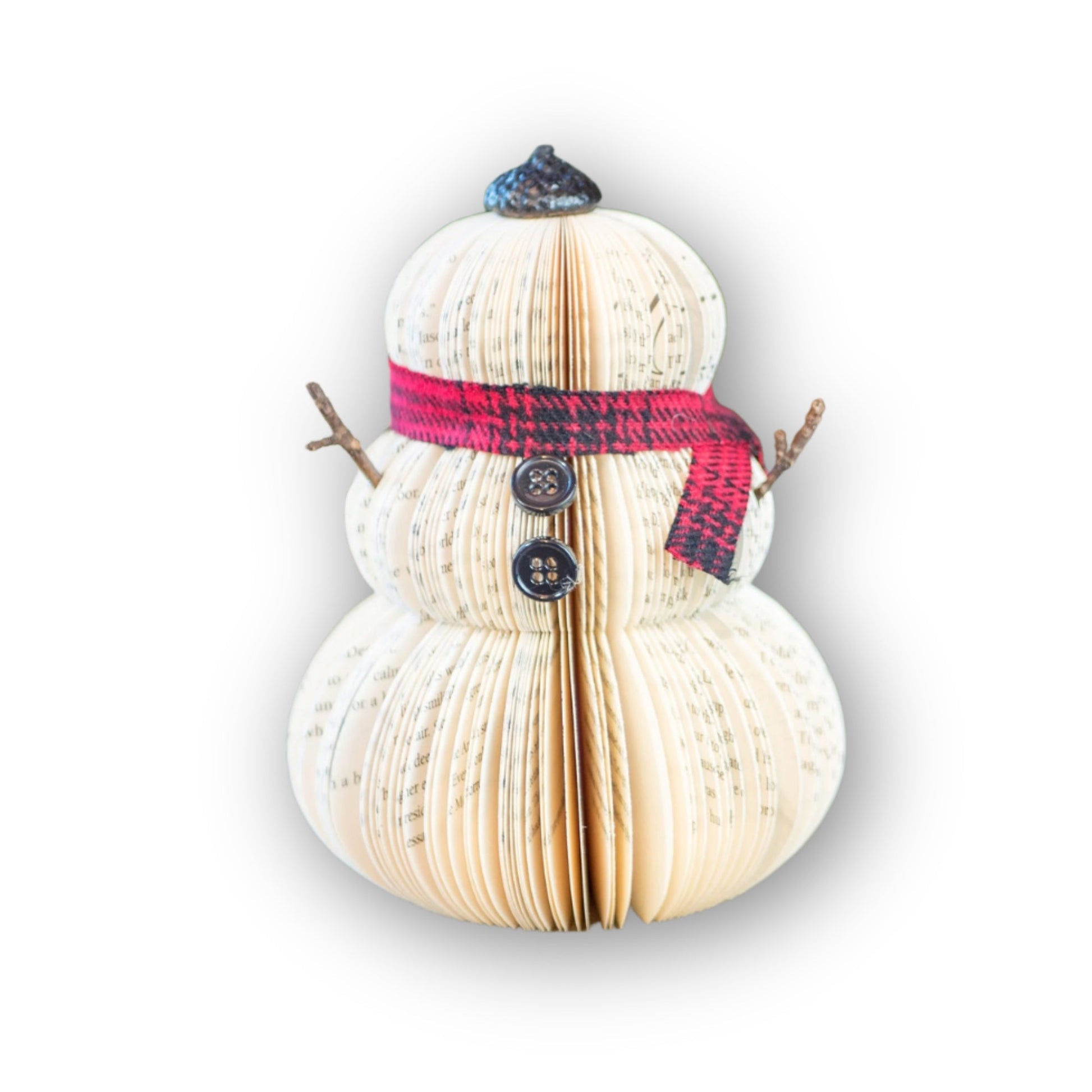 Each book snowman is handmade from a repurposed book and are truly one of a kind. The materials used are almost all upcycled or foraged from nature making them eco-friendly and sustainable. Book Page snowmen are a delight for literary lovers, holiday décor enthusiasts, and snowmen collectors.