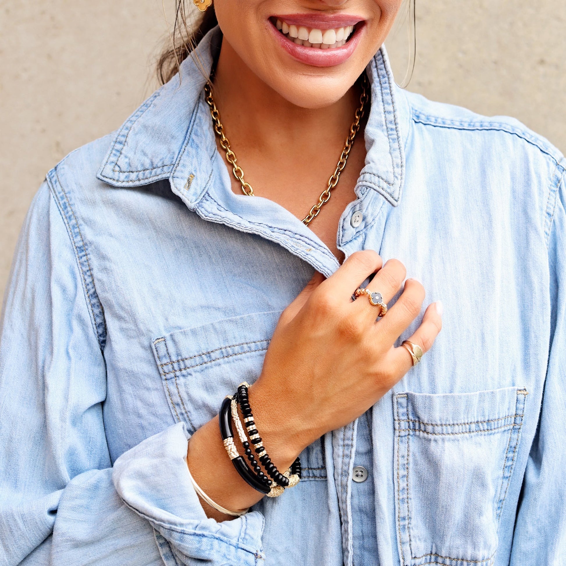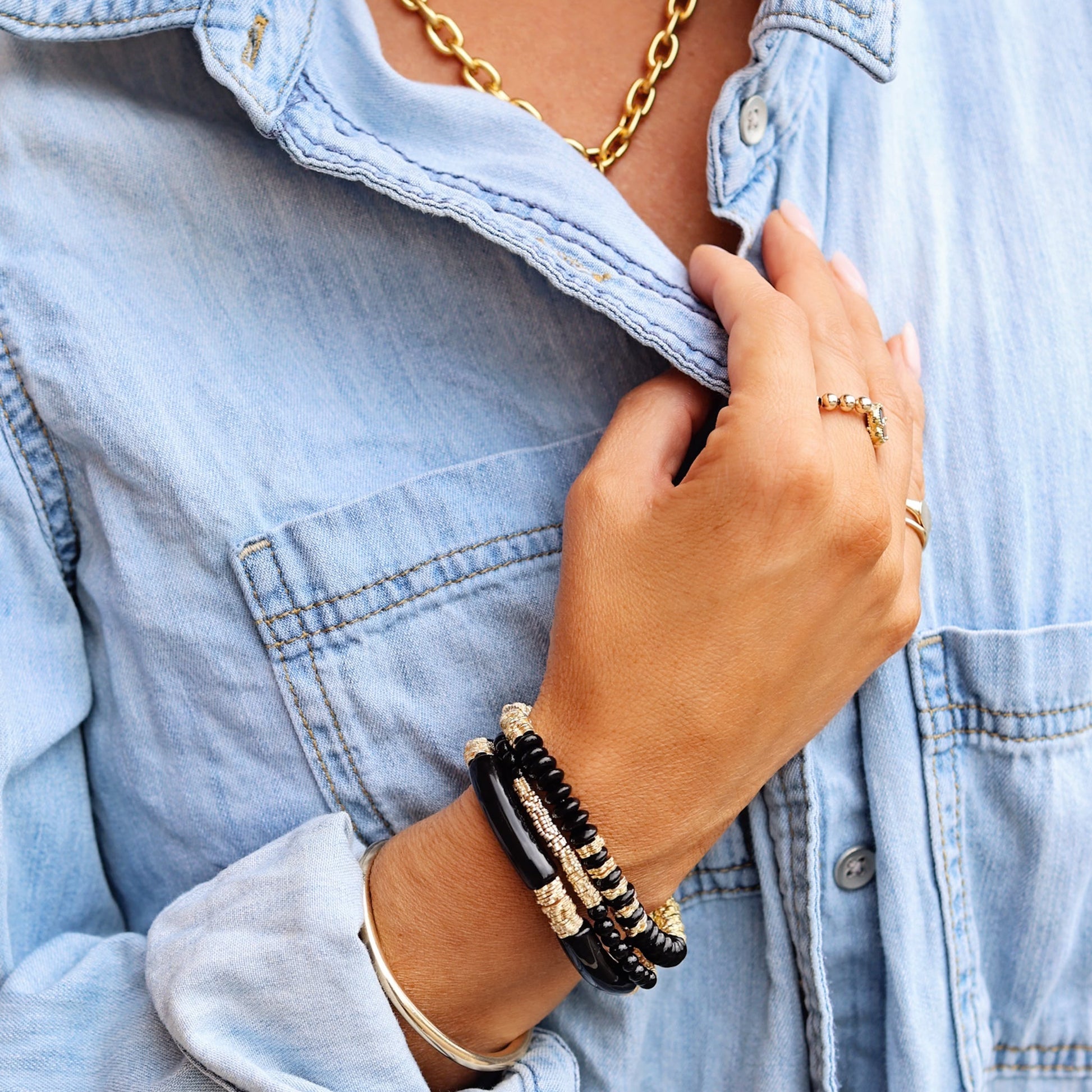 Classic and chic, this three-piece bracelet stack is a striking counterpart to our bestselling Clearwater Beach design. Featuring black beads with textured gold-plated accents, each bracelet is made with a unique pattern and bead size for dimension and depth. Wear them together for a statement look, or individually for a more minimal style. Handmade with a mix of glass and gold-plated textured beads. To preserve the finish, avoid water, lotions, perfumes, and harsh chemicals. Store in a dry place when not in use.