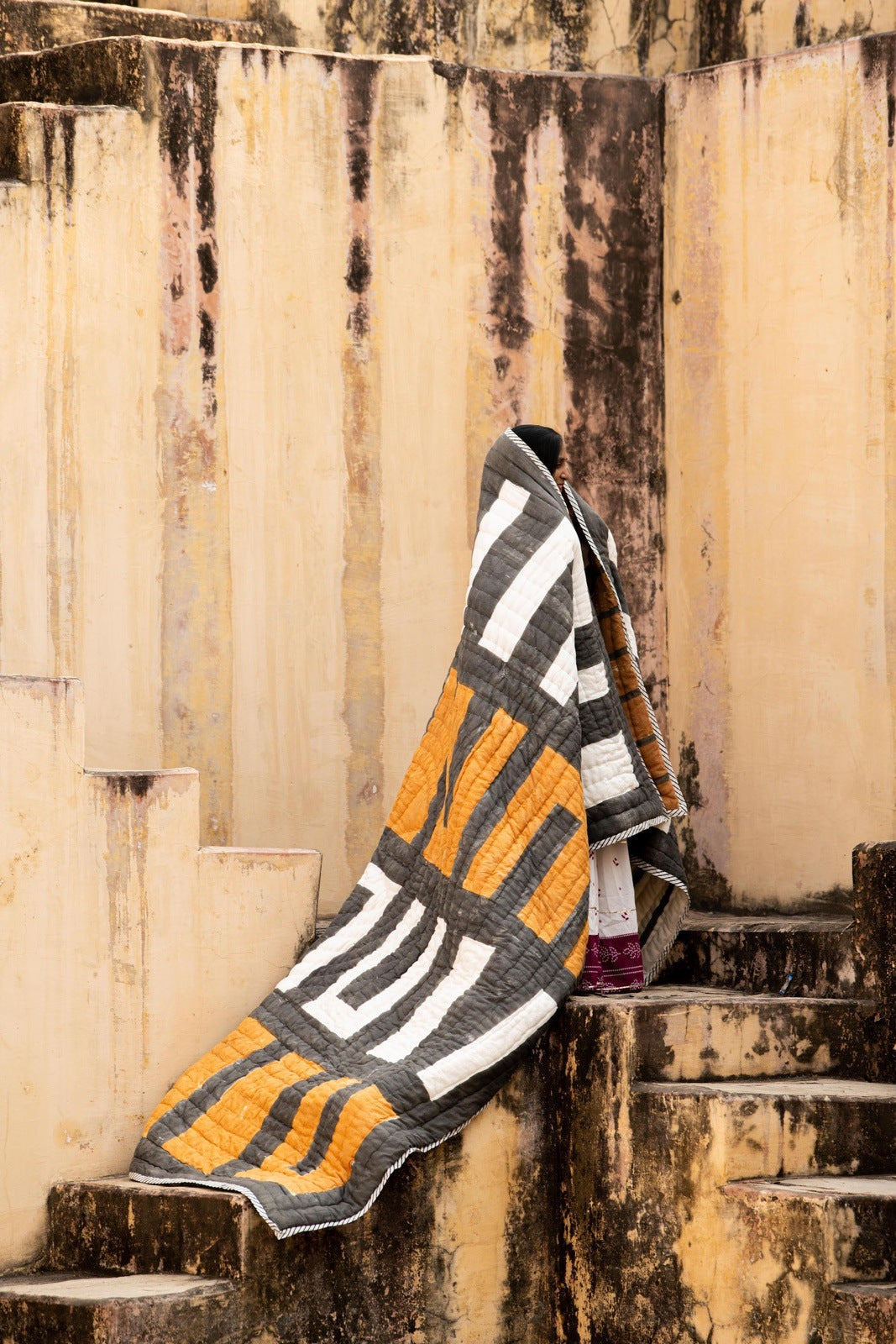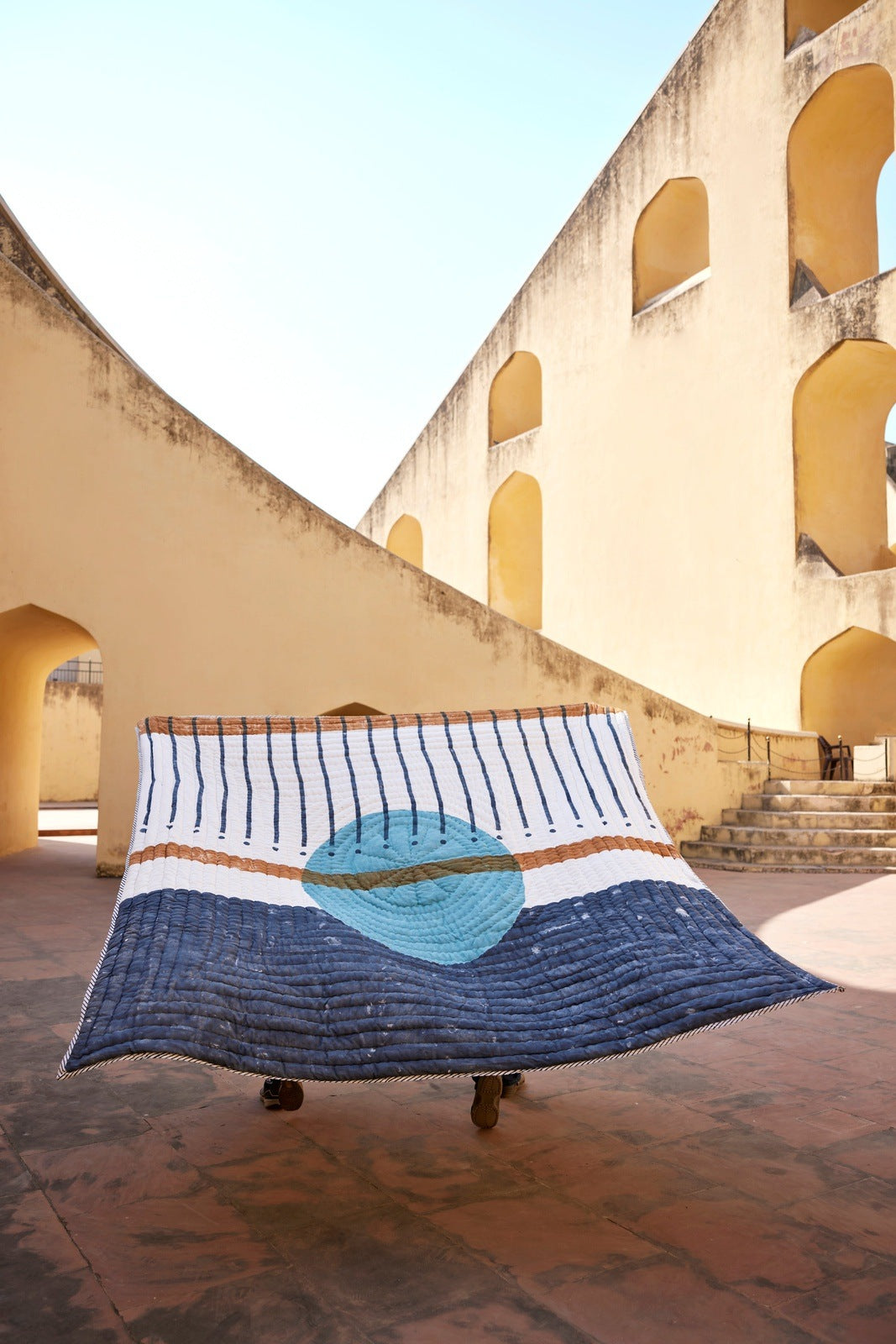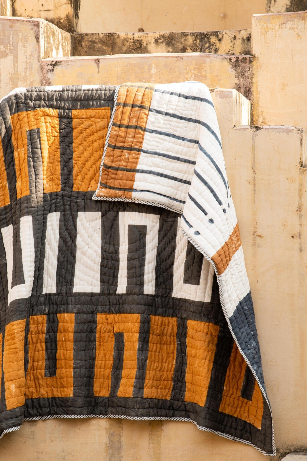Each quilt is handmade, requiring attention from 4 different artisans, including wood carvers, block printers, quiltmakers, and dye specialists. The design is hand-pressed onto each quilt using hand-carved wooden blocks dipped in dyes. The printed cotton shells are brought to the homes of quiltmakers, who stuff and stitch the quilts by hand, creating the final product. Our quilts are made in small batches. Due to the handcrafted nature of this item, expect slight variations in the appearance of each unique piece. - 100% cotton voile exterior - 100% cotton stuffing - Made in India - Ships from California - Twin size: 68″ x 86″ - Queen size: 96″ x 96″ - King size: 108″ x 108″