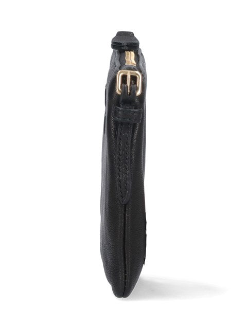 Miu Miu logo mini pouch in black lamb nappa leather with adjustable and removable shoulder strap, zip closure, embossed logo on the front, one inner compartment.