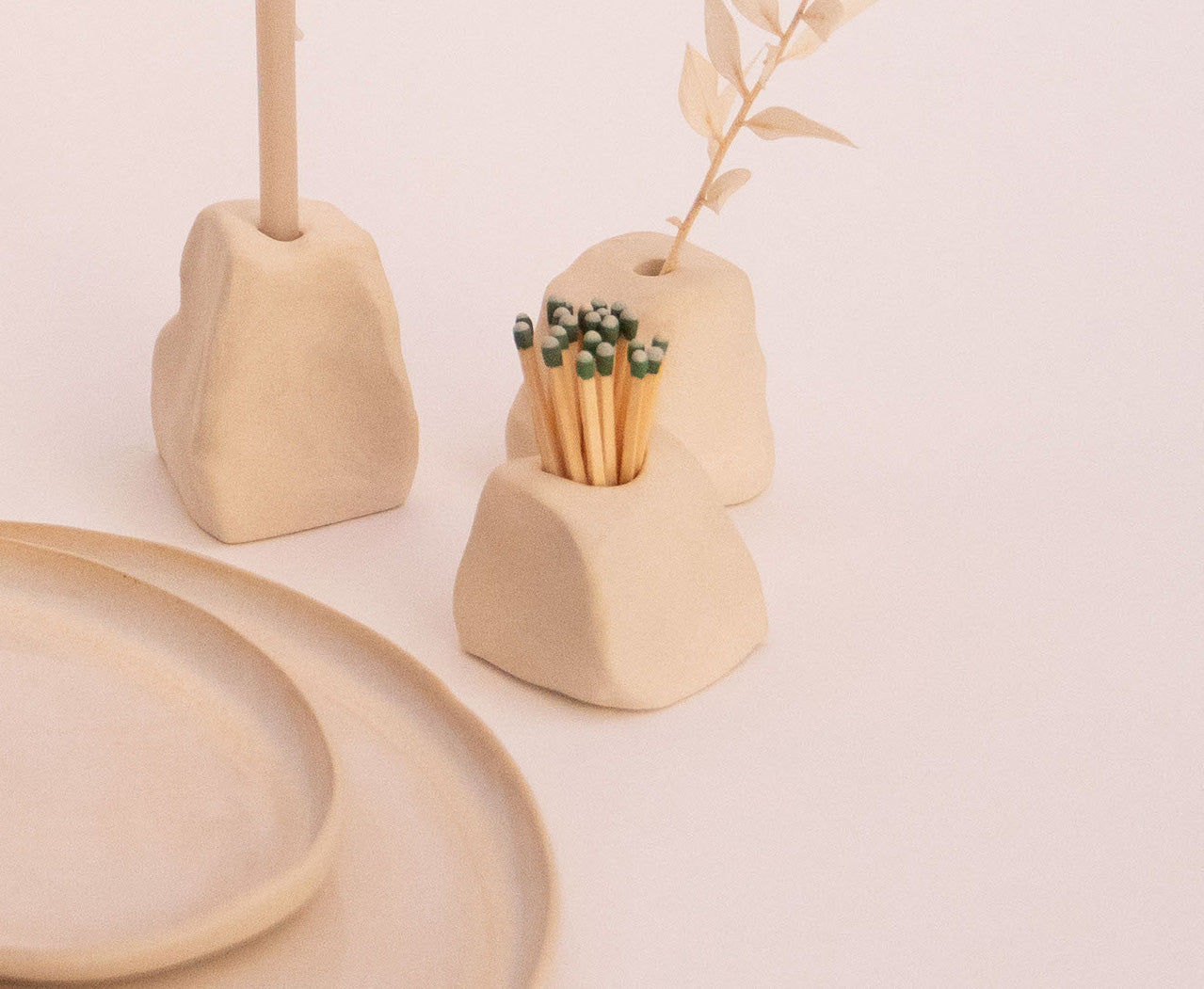 Rooted in the quiet beauty of raw clay and soft form, the Monolith Match Holders and Strikers are sculpted entirely by hand—each one a small gesture of presence and permanence. Designed to cradle strike anywhere matches, their organic silhouettes echo the great mesas and monoliths of the desert, at a small scale fit for interior surfaces. Every part of the surface is strik-eable, for a moment of raw chemistry, mimicking the light, acrid sting of desert air. Each piece is handmade in Brooklyn — subtle variations in form are part of their character.