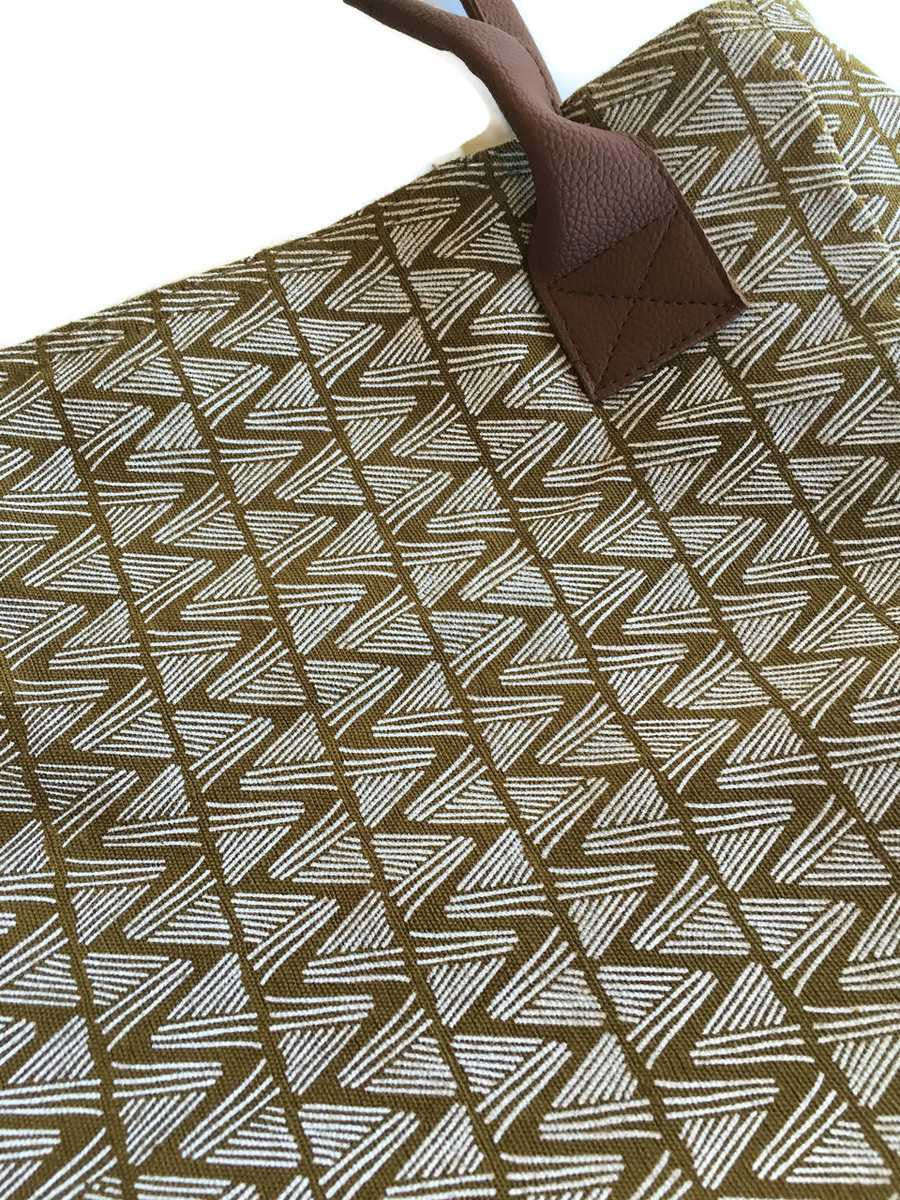 Made from gold-colored cotton canvas, using 100% upcycled materials from waste from traditional garment factories. White pattern screen printed using eco-friendly dyes.