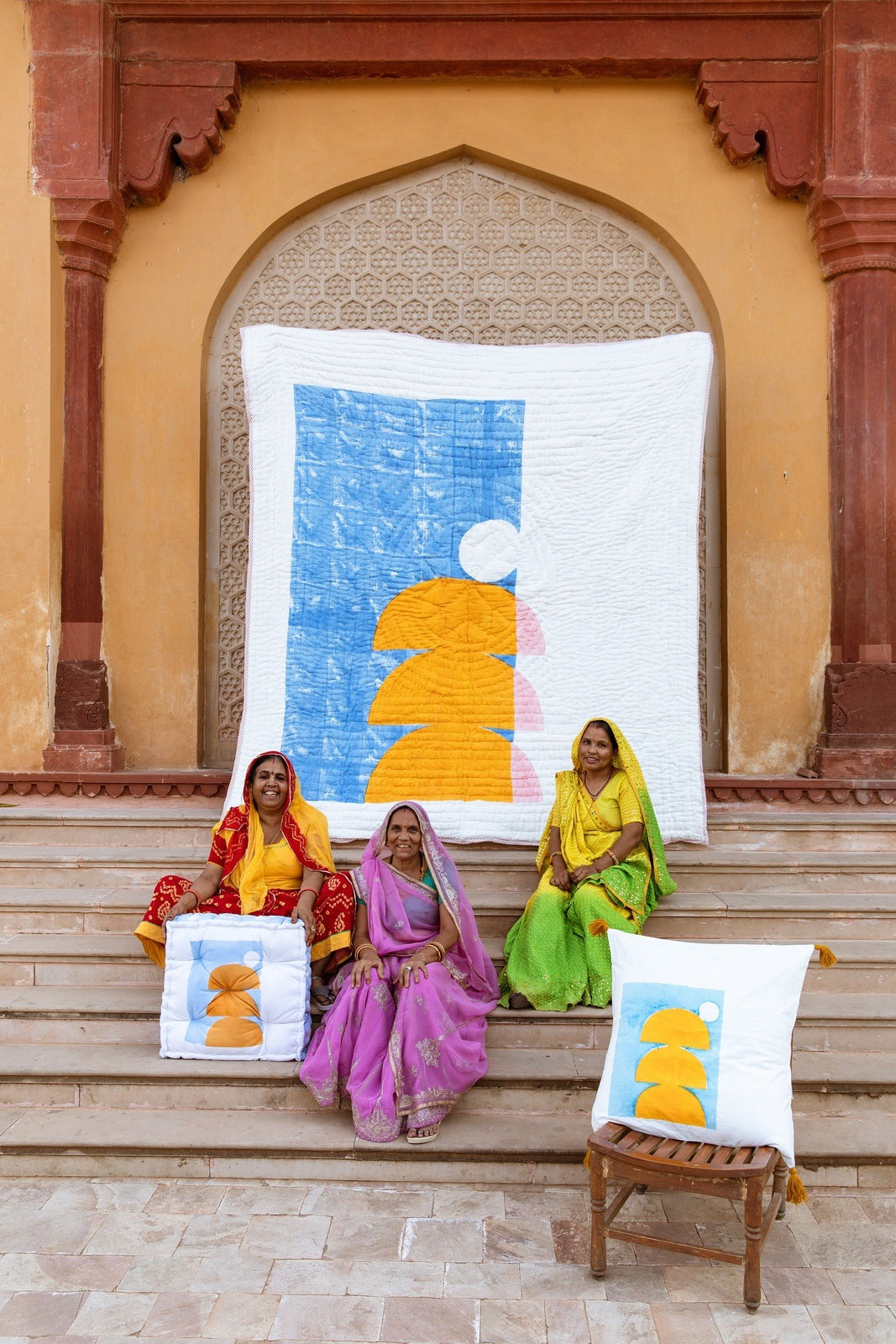 This reversible, hand-printed quilt, set against a fresh white base, captures the essence of summer. One side paints an abstract ocean sunset with pink, blue, and yellow hues, while the other offers a vibrant mix of these colors in a beachy design. Each quilt is handmade from 100% cotton and requires attention from four artisans, including wood carvers, block printers, quiltmakers, and dye specialists. The design is hand-pressed onto each quilt using hand-carved wooden blocks dipped in dyes. The printed cotton shells are brought to the homes of quiltmakers, who stuff and stitch the quilts by hand, creating the final product. CQC LA quilts are made in small batches. Due to the handcrafted nature of this item, expect slight variations in the appearance of each unique piece. - 100% cotton voile exterior - 100% cotton stuffing - Made in India - Ships from California - Queen size: 96″ x 96″ - King size: 108″ x 108″ - Sham size: 26″ x 26″