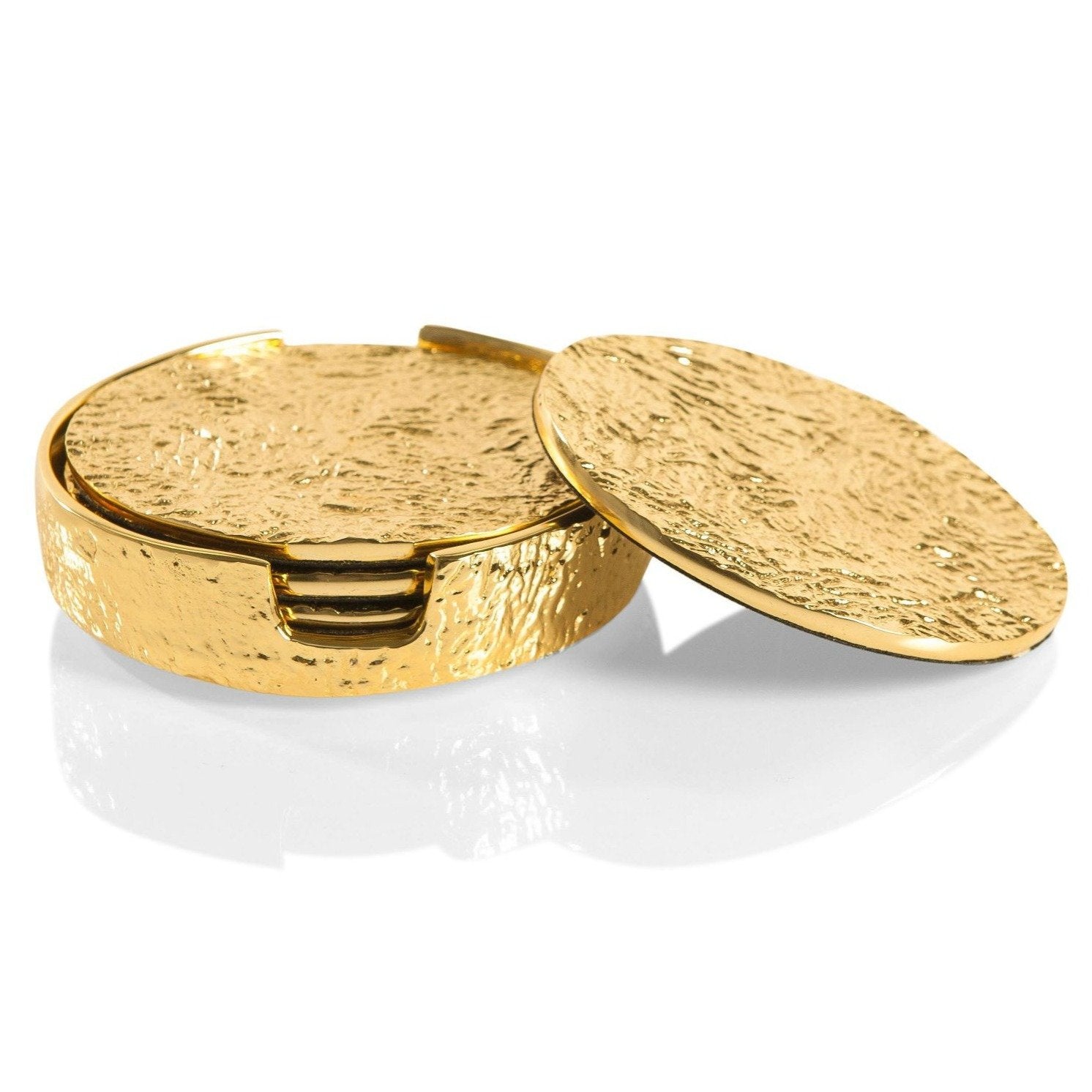 Hand made by artisans , the golden nest like texture ,combines elegance and practicality for your table. Each of our creations is designed in our San Francisco studio. Master craftsmen using centuries old technique of sand casting create the original mould and skilled artisans hand create every piece, with pride, in our family owned factory. Details Dimensions : 1"H x 4.5" Dia Finish : Gold Material : Aluminum Use and Care Given its handmade and hand-finished nature, variations in the piece are to be expected and celebrated. No two pieces are exactly alike. Hand wash with mild soap, water, and towel dry. Do not use abrasives or chemicals to clean the metal as it may scratch and discolor. Not dishwasher safe. Will not tarnish